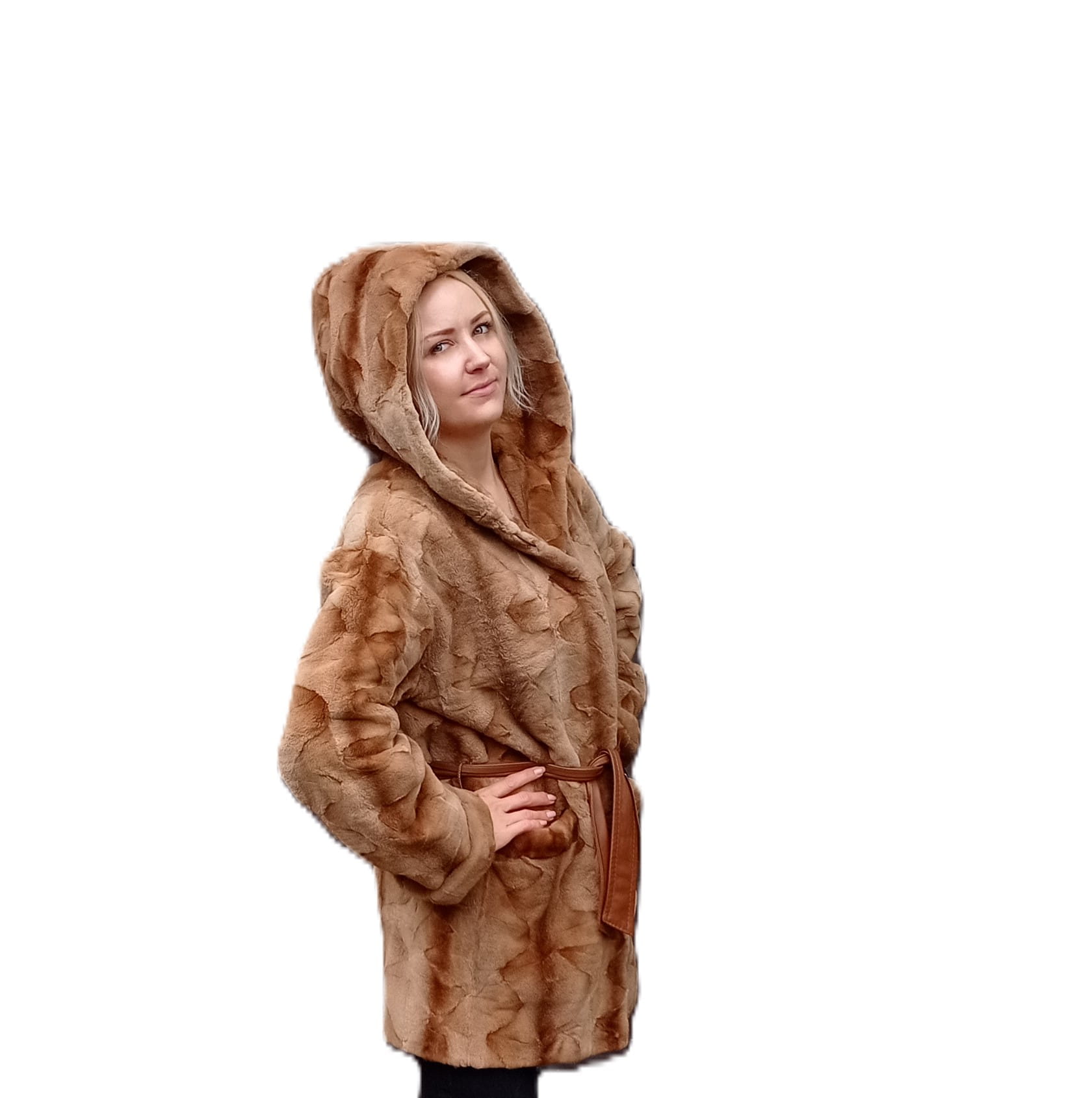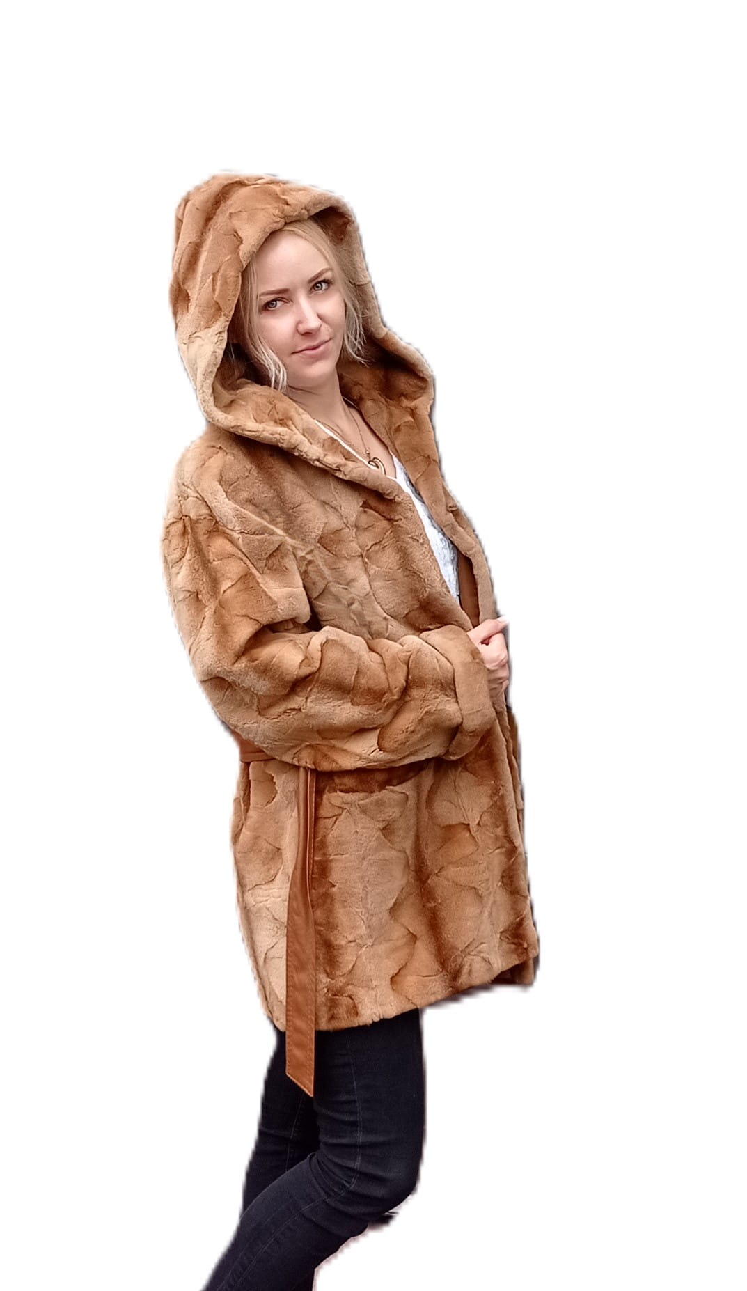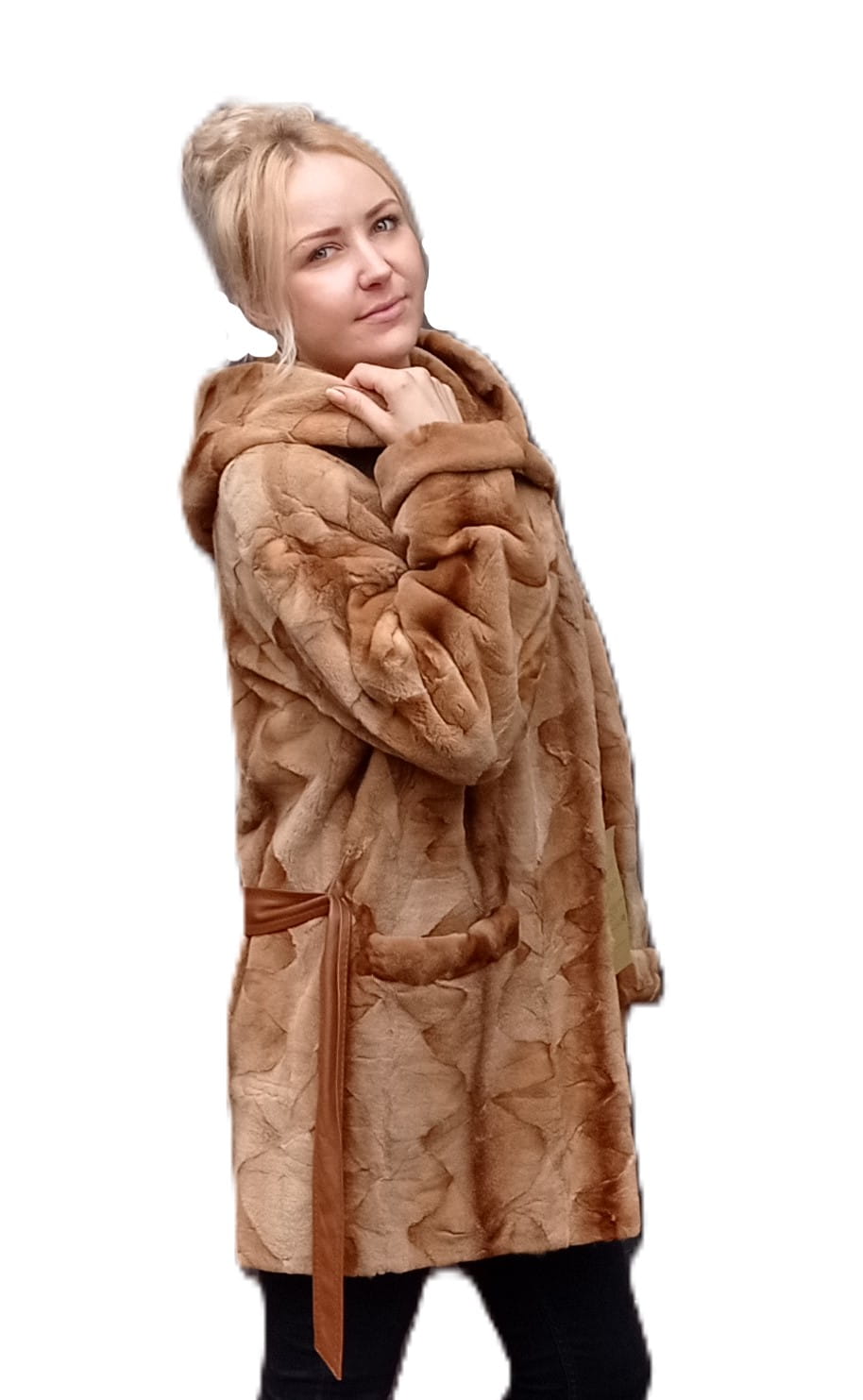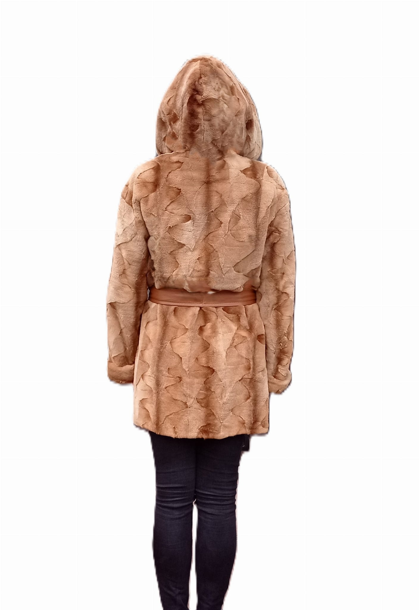 Model z obszernym kapturem, dużymi kieszeniami i paskiem skórzanym zapewnia zarówno praktyczność, jak i efektowny wygląd.