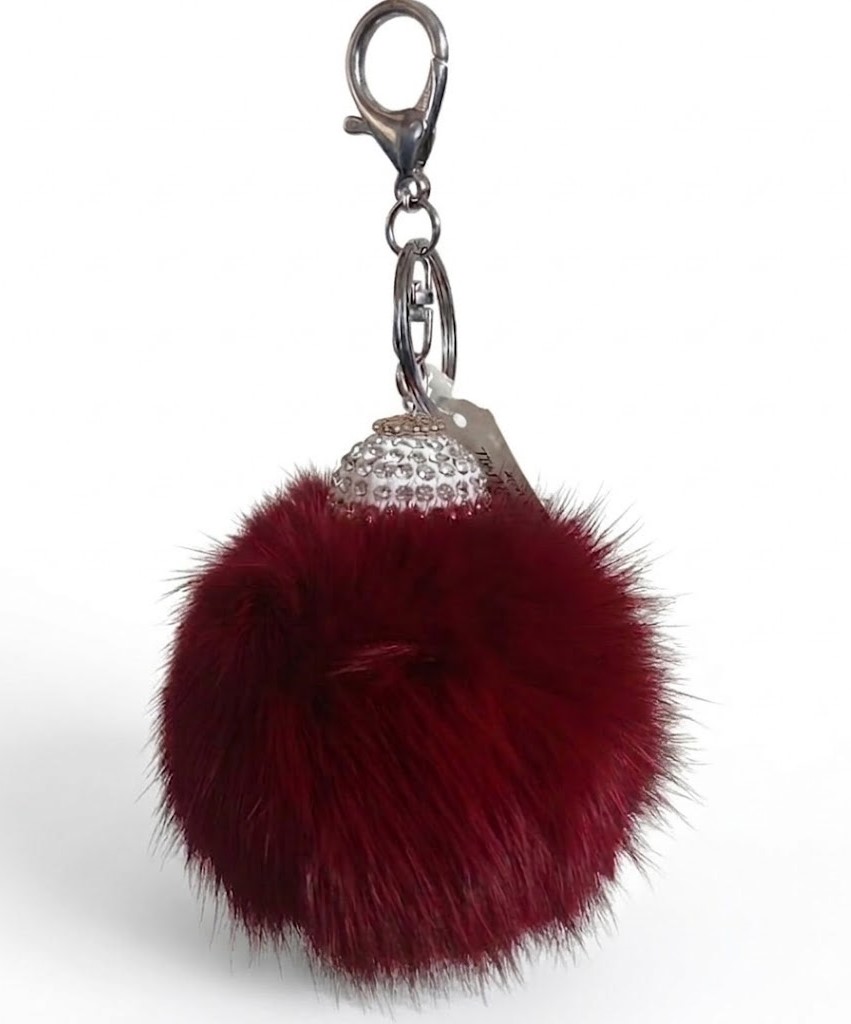 Elegancki brelok z futra lisa z cyrkoniami - kolor bordowy