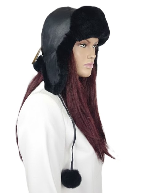 Czapka uszanka damska z futra królika Rex i skóry czarna luksusowa