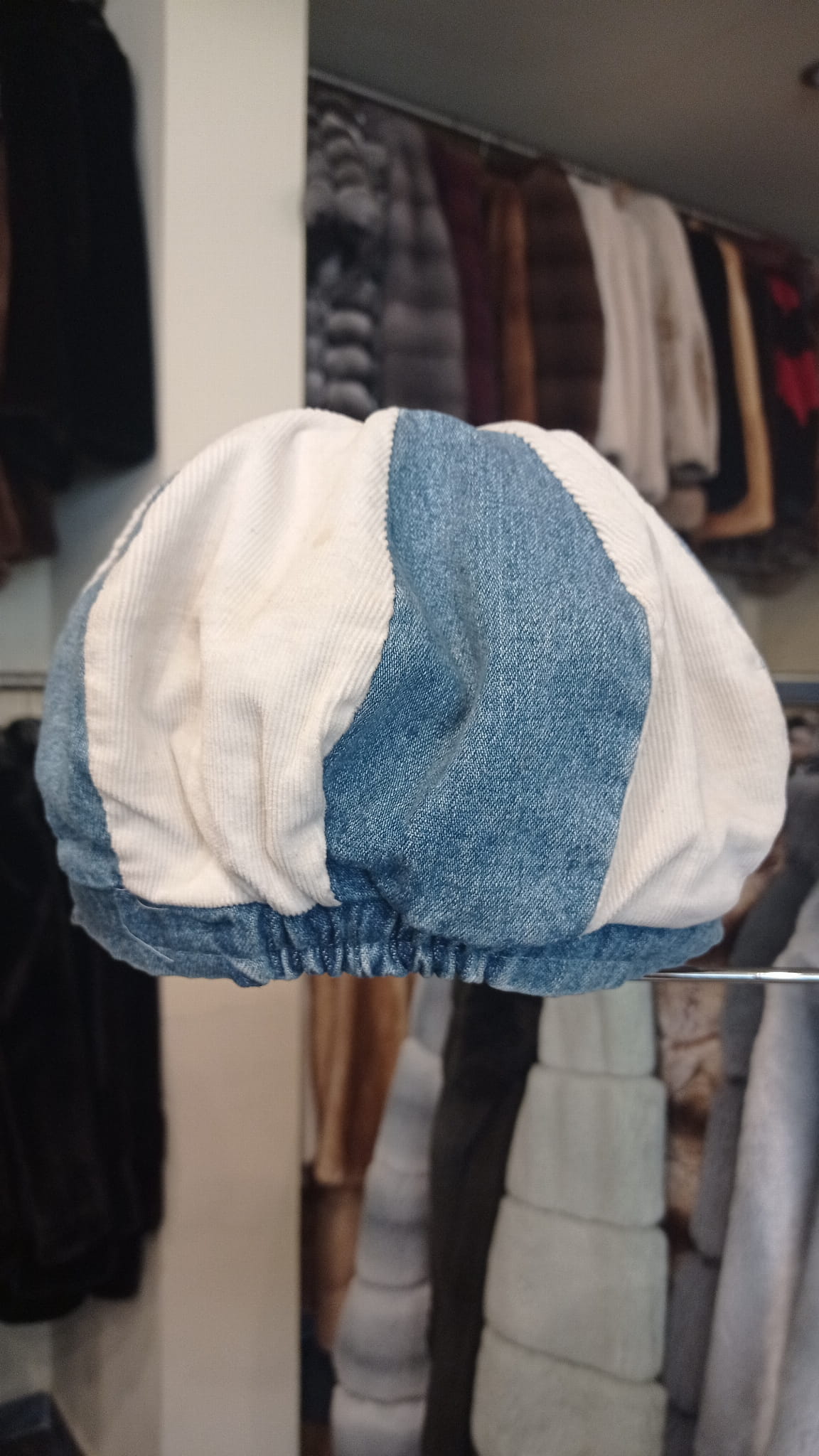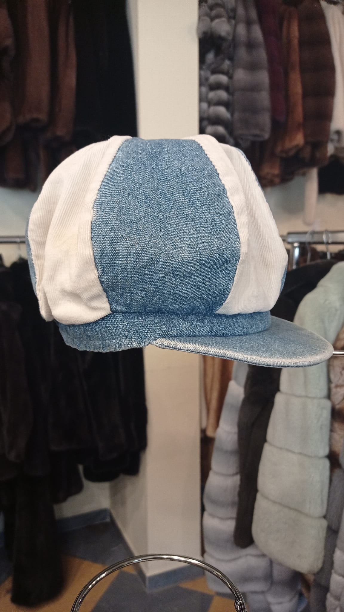 Czapka z daszkiem ośmiokątna w stylu gazeciarza, dwukolorowa: jeans + biel