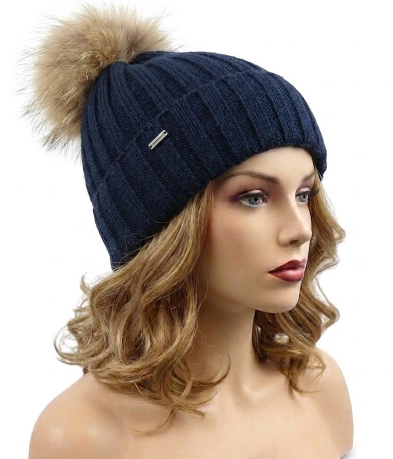 Czapka zimowa w kolorze granatowym z pomponem z naturalnego futra to elegancki i ponadczasowy dodatek na chłodne dni.