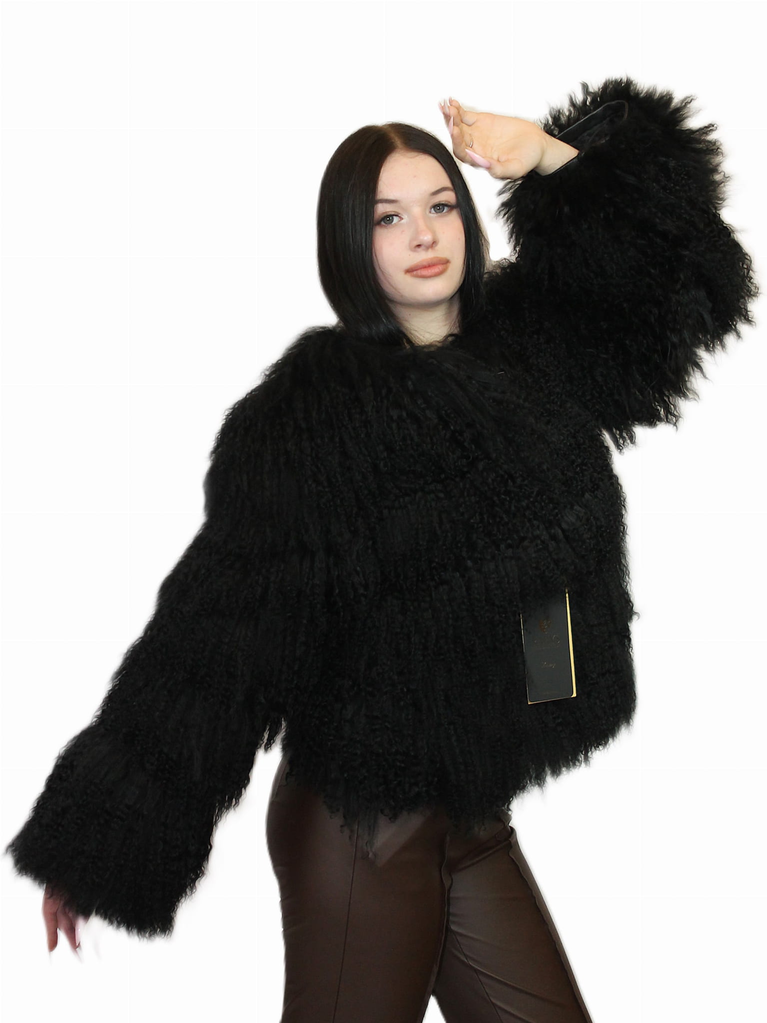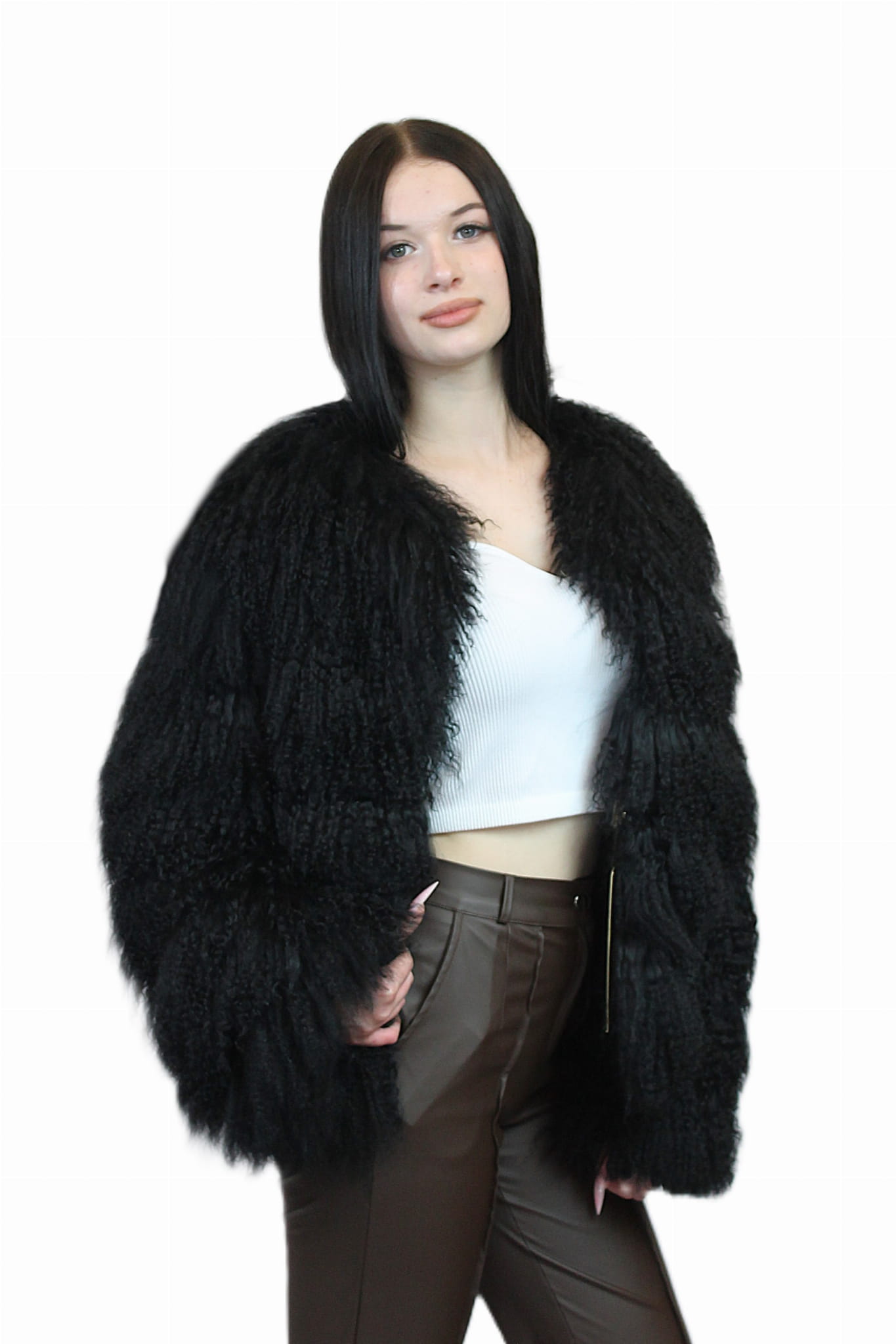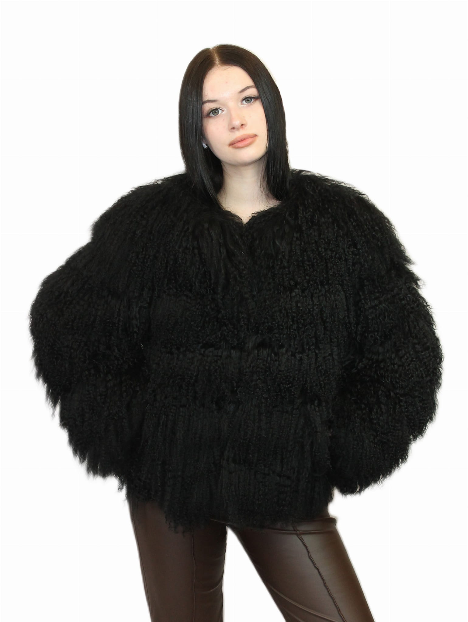 Efektowna kurtka wykonana z naturalnego futra lamy w głębokim odcieniu czerni.
