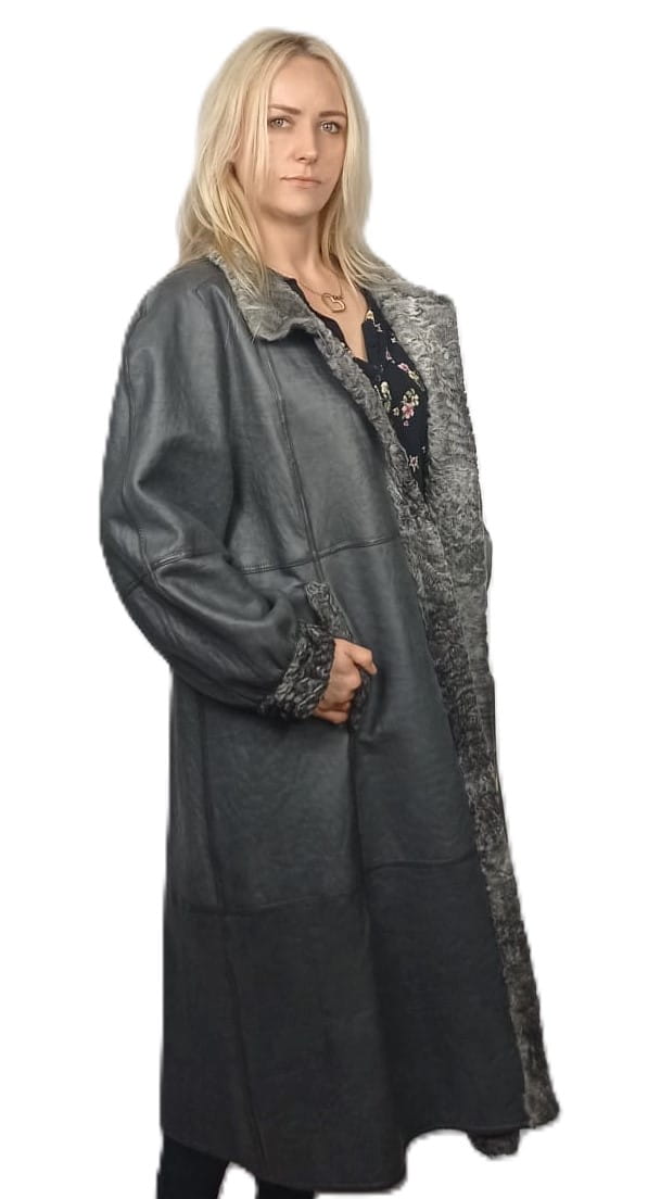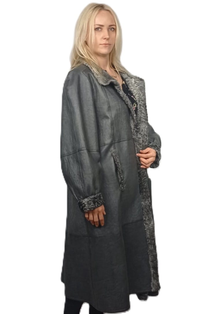 Ekskluzywny damski płaszcz dwustronny z naturalnego karakuła i skóry – odcień szarości