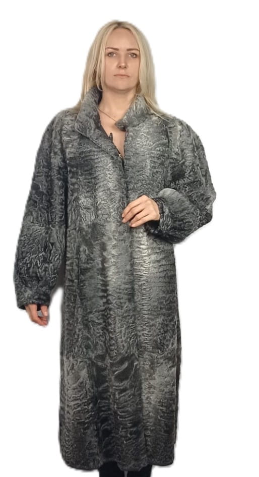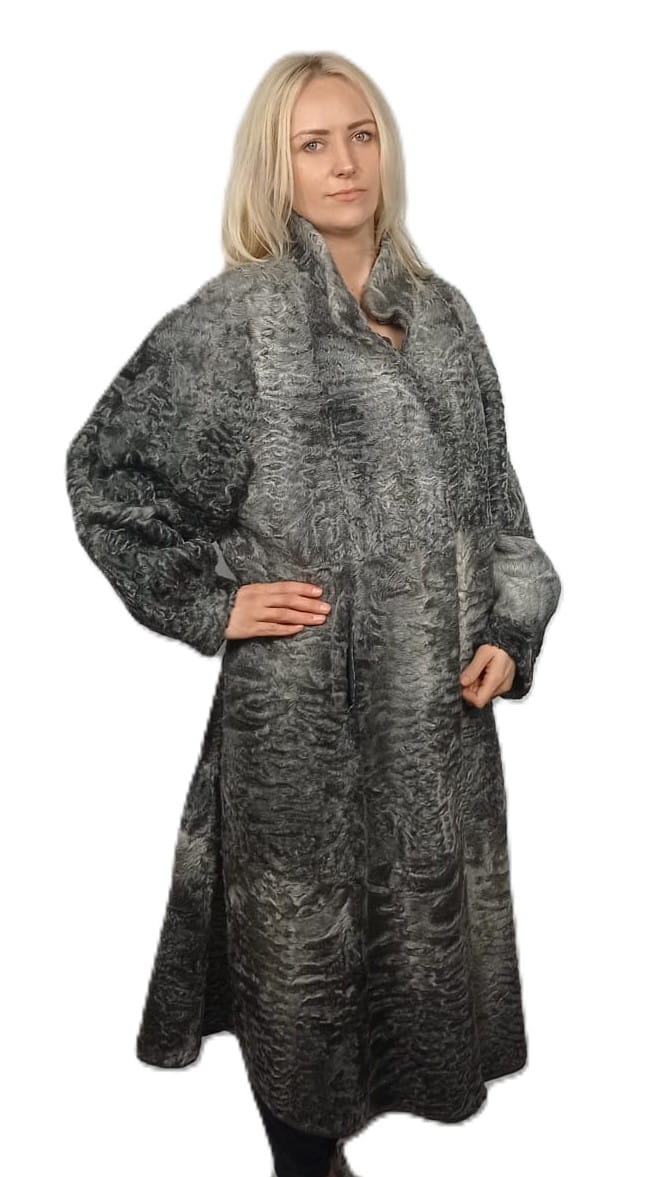 Ekskluzywny damski płaszcz dwustronny wykonany z naturalnego futra karakuł w odcieniach szarości to połączenie klasy, luksusu i praktycznego designu.