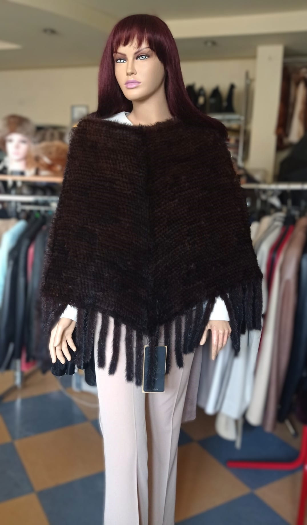 Ponczo z naturalnego futra norki w kolorze ciemnego brązu wyróżnia się prostym, klasycznym krojem i miękką, jedwabistą strukturą.