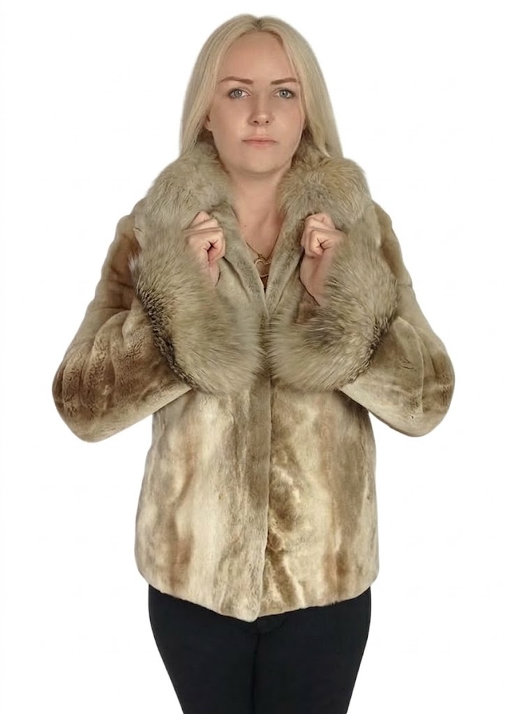 Model został wykończony efektownym kołnierzem oraz obszyciami rękawów z naturalnego futra lisa, nadając całości wyrafinowanego charakteru.