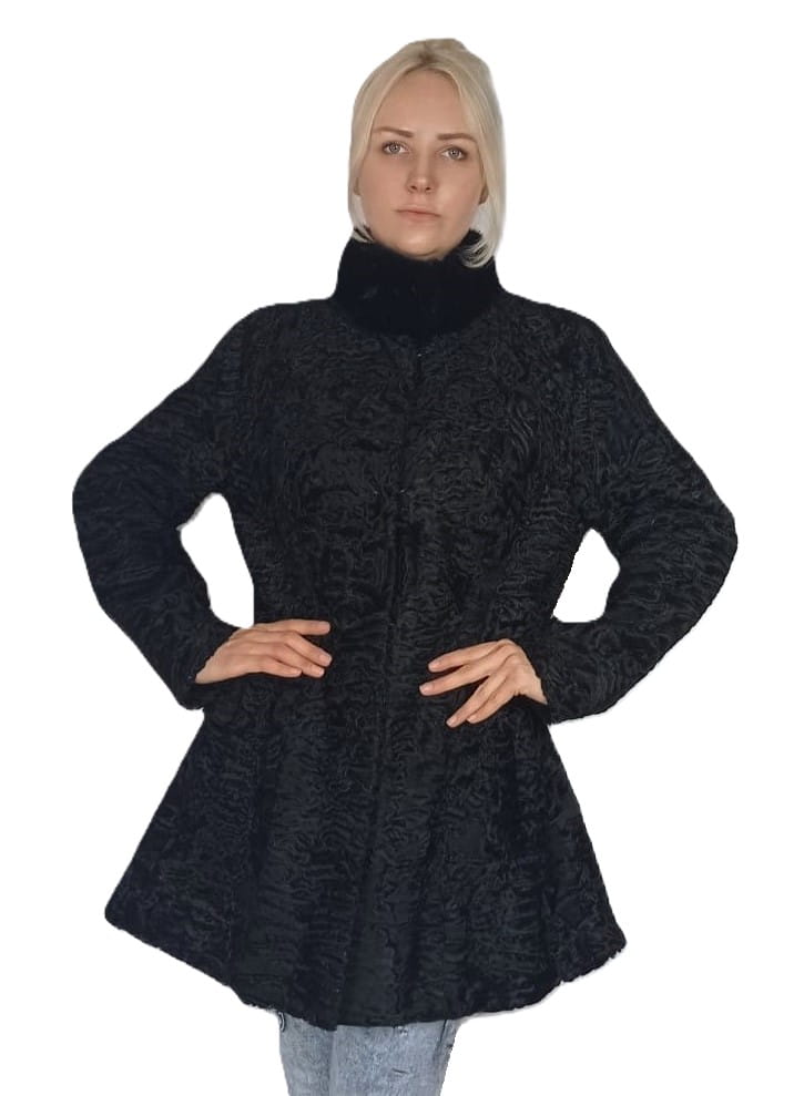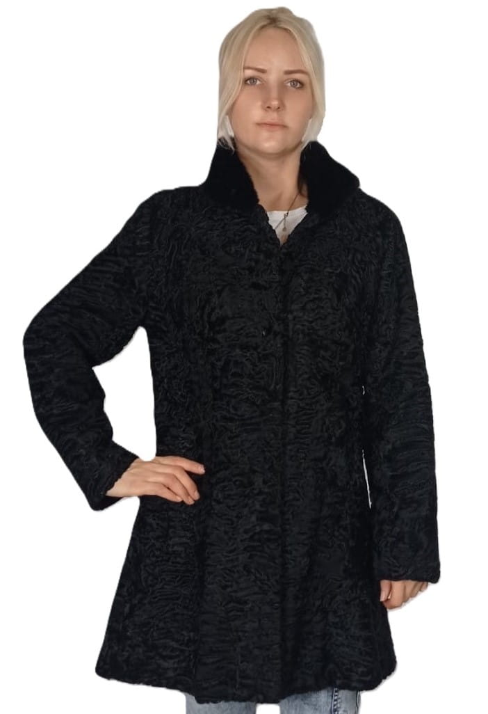 Eleganckie futro wykonane z wysokogatunkowego karakuła, wyróżniające się subtelną strukturą i miękkim, naturalnym połyskiem.