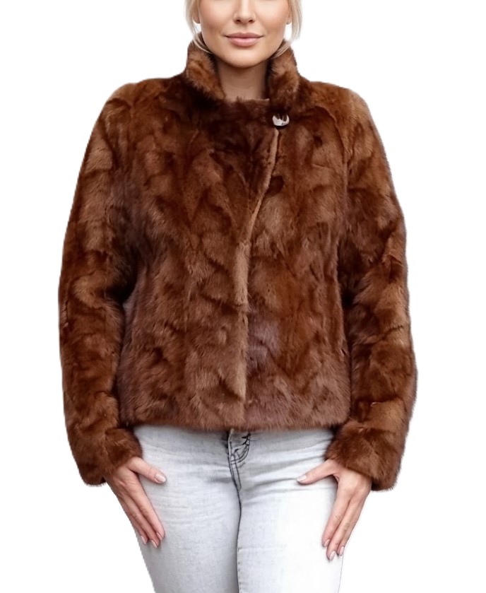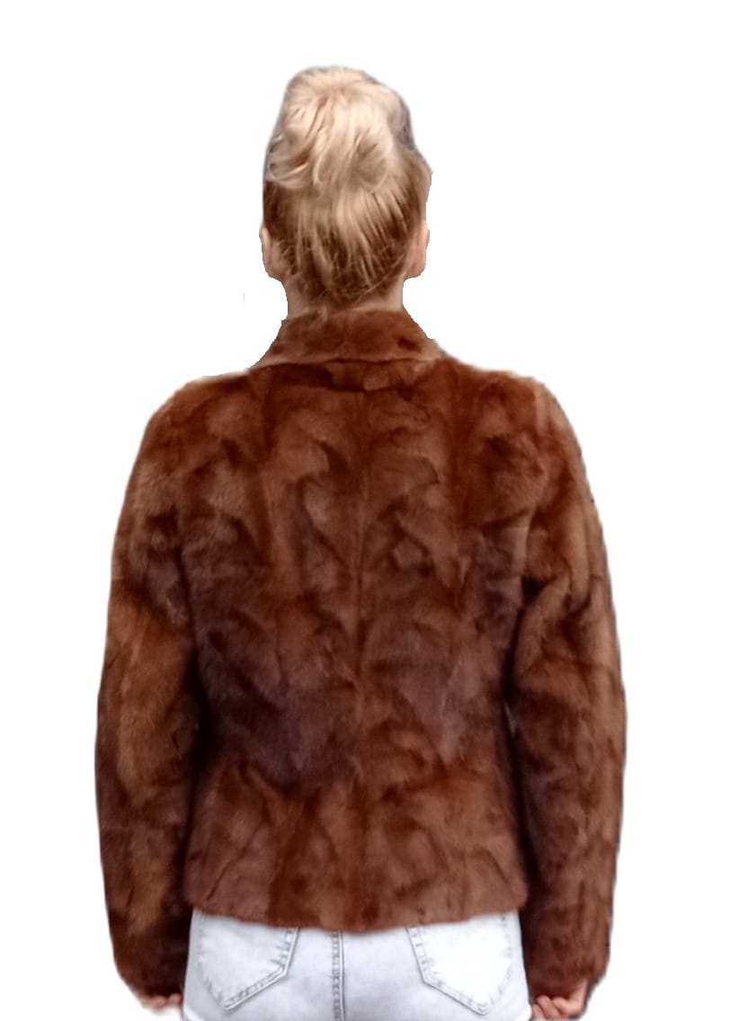zostało wykonane z najwyższej jakości naturalnego futra norek w klasycznym, ciepłym odcieniu brązu.