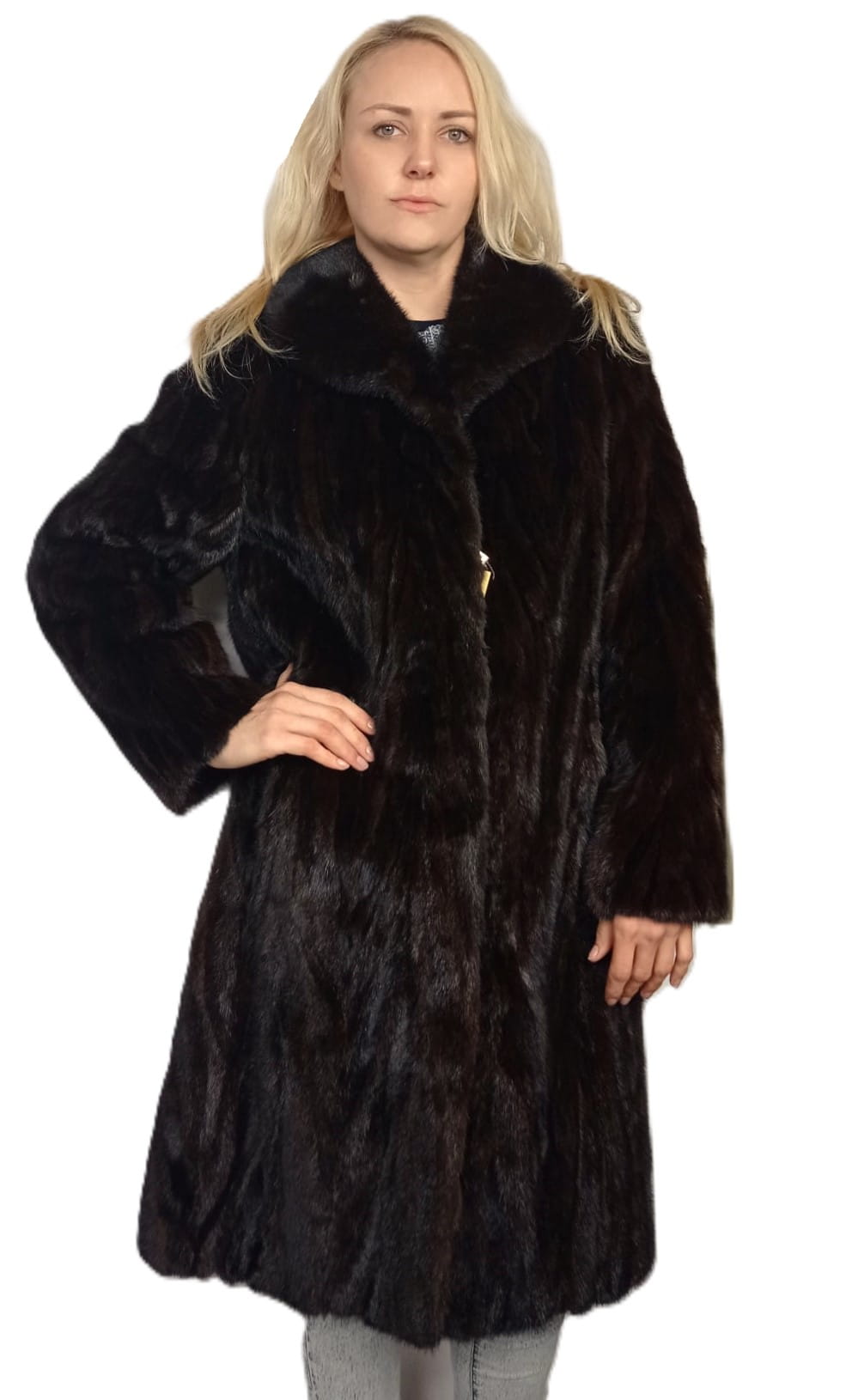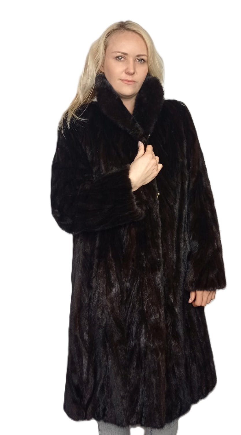 Luksusowe futro damskie wykonane z naturalnego futra norek w szlachetnym, głębokim odcieniu brązu.