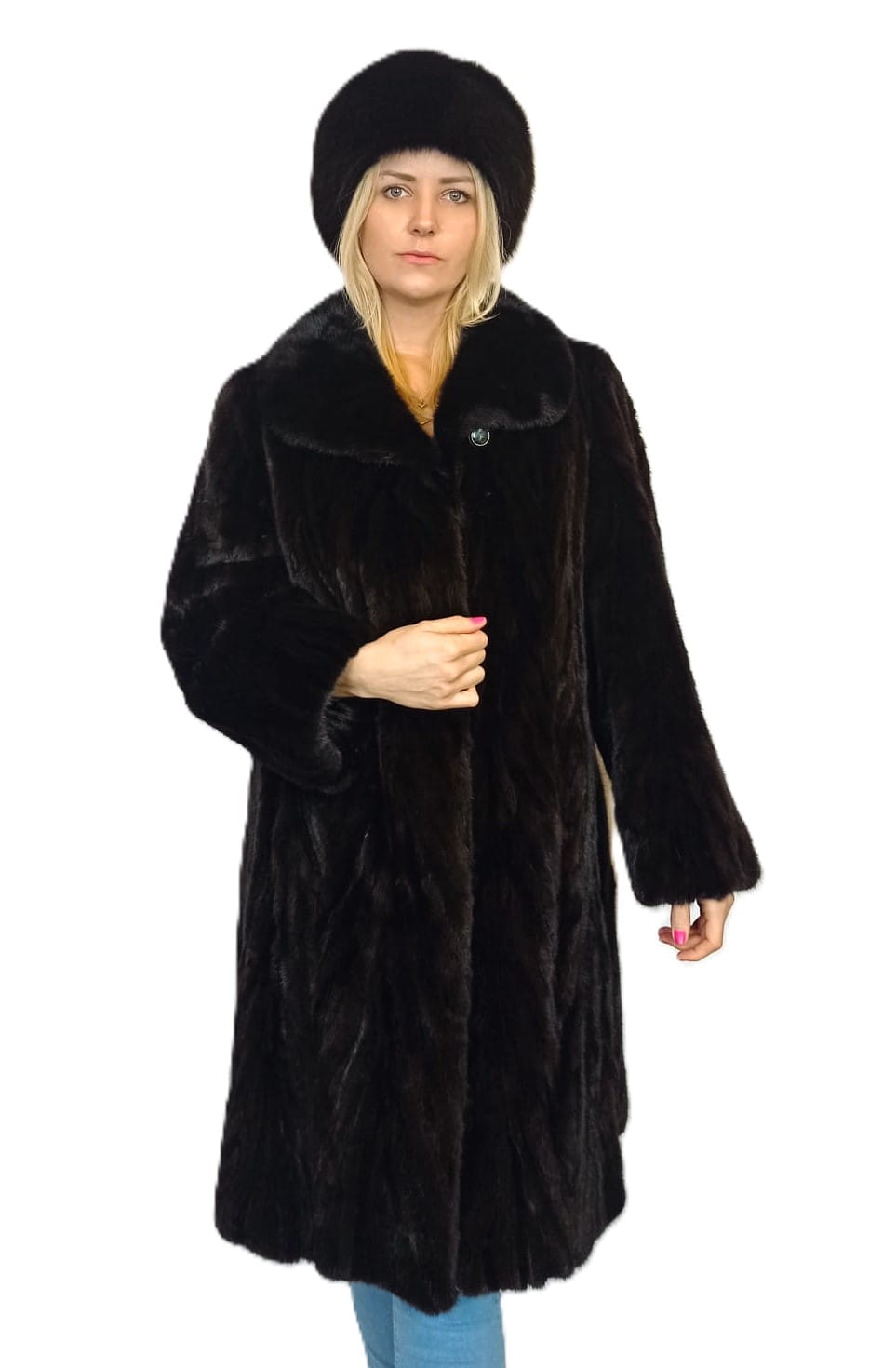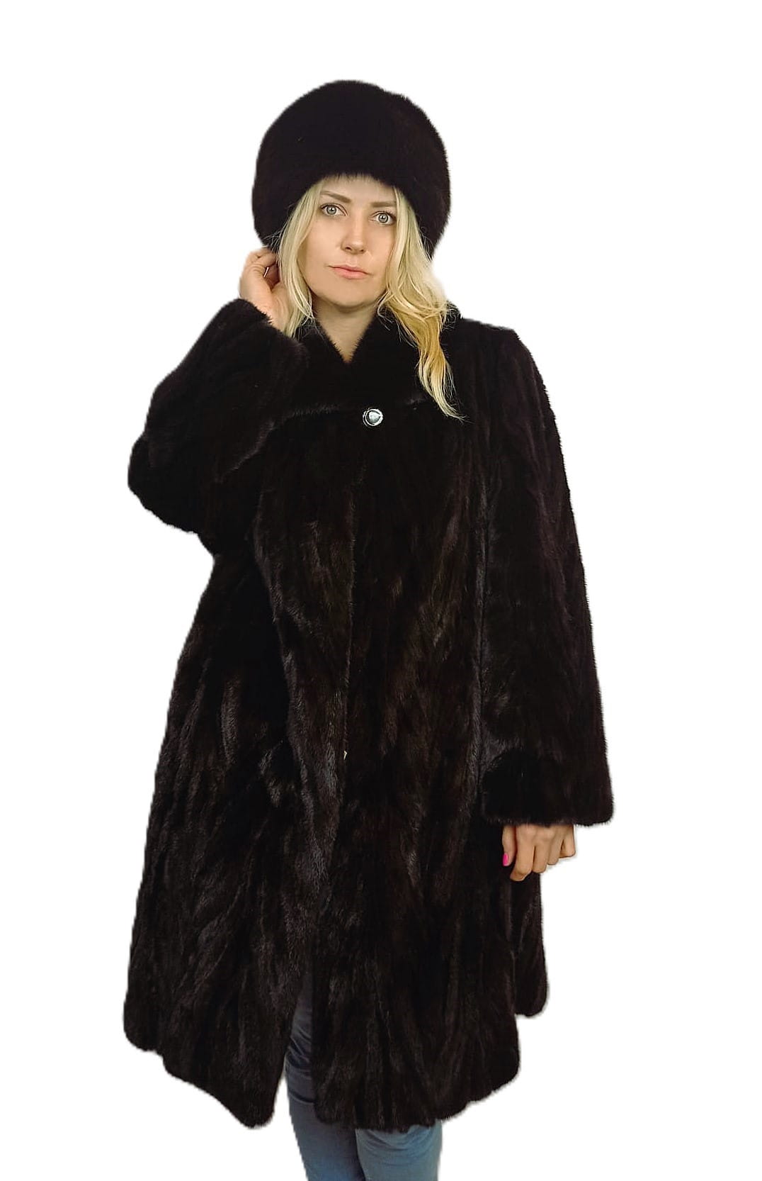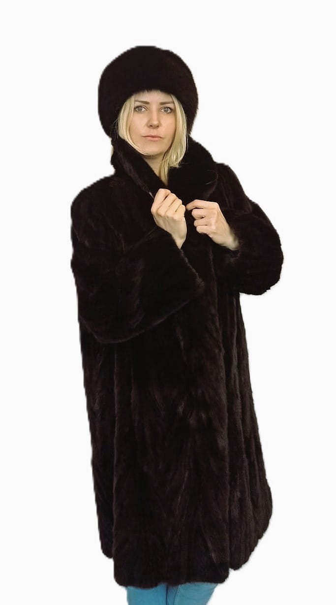 Luksusowe futro damskie wykonane z naturalnego futra norek w szlachetnym, głębokim odcieniu brązu.