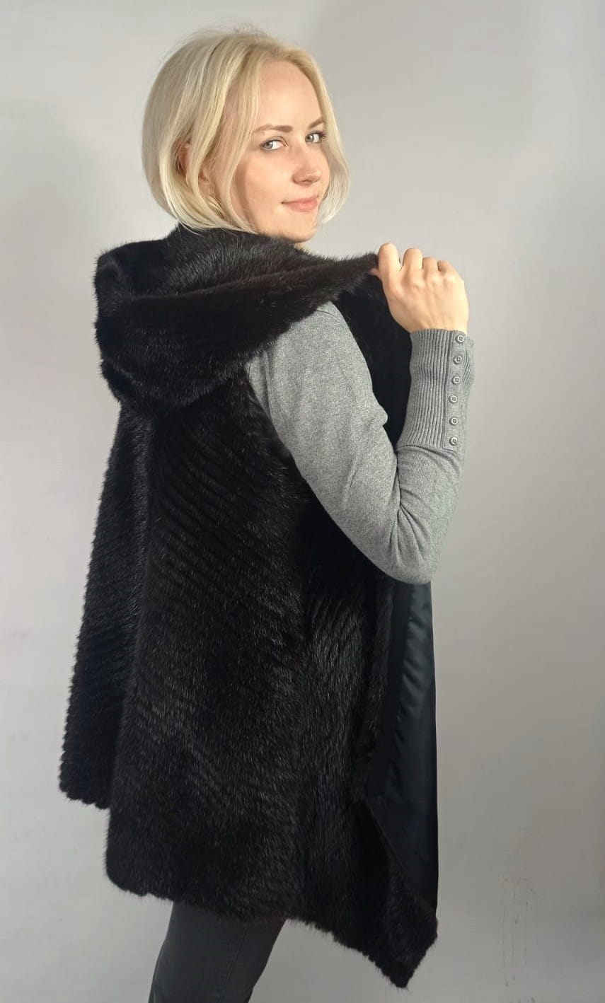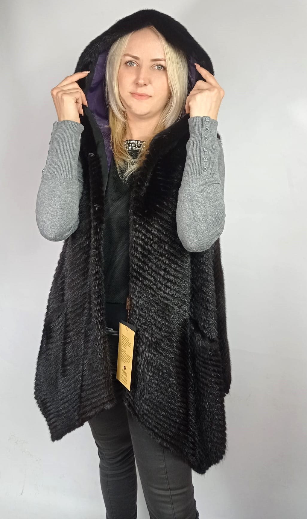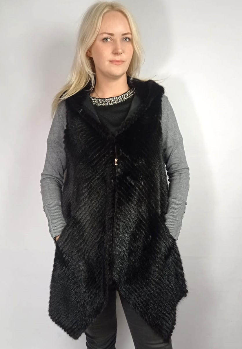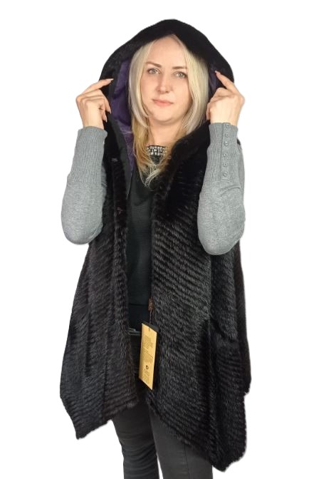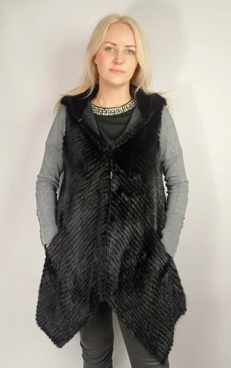 Asymetryczna kamizelka z kapturem wykonana z naturalnego futra grzbietów norczych łączy luksus i nowoczesny design.