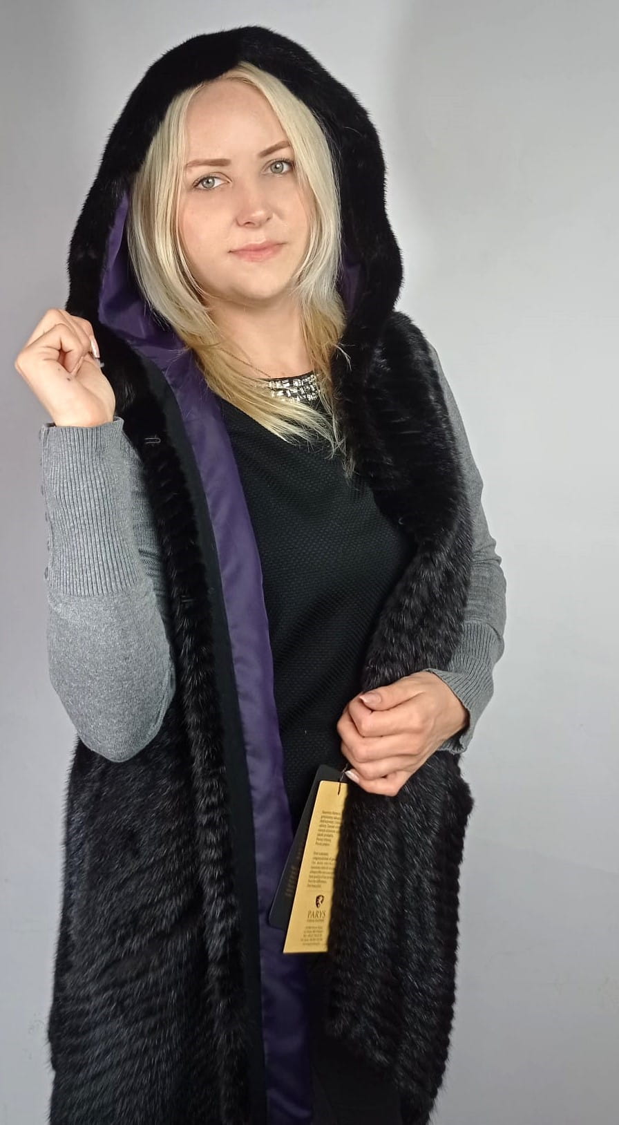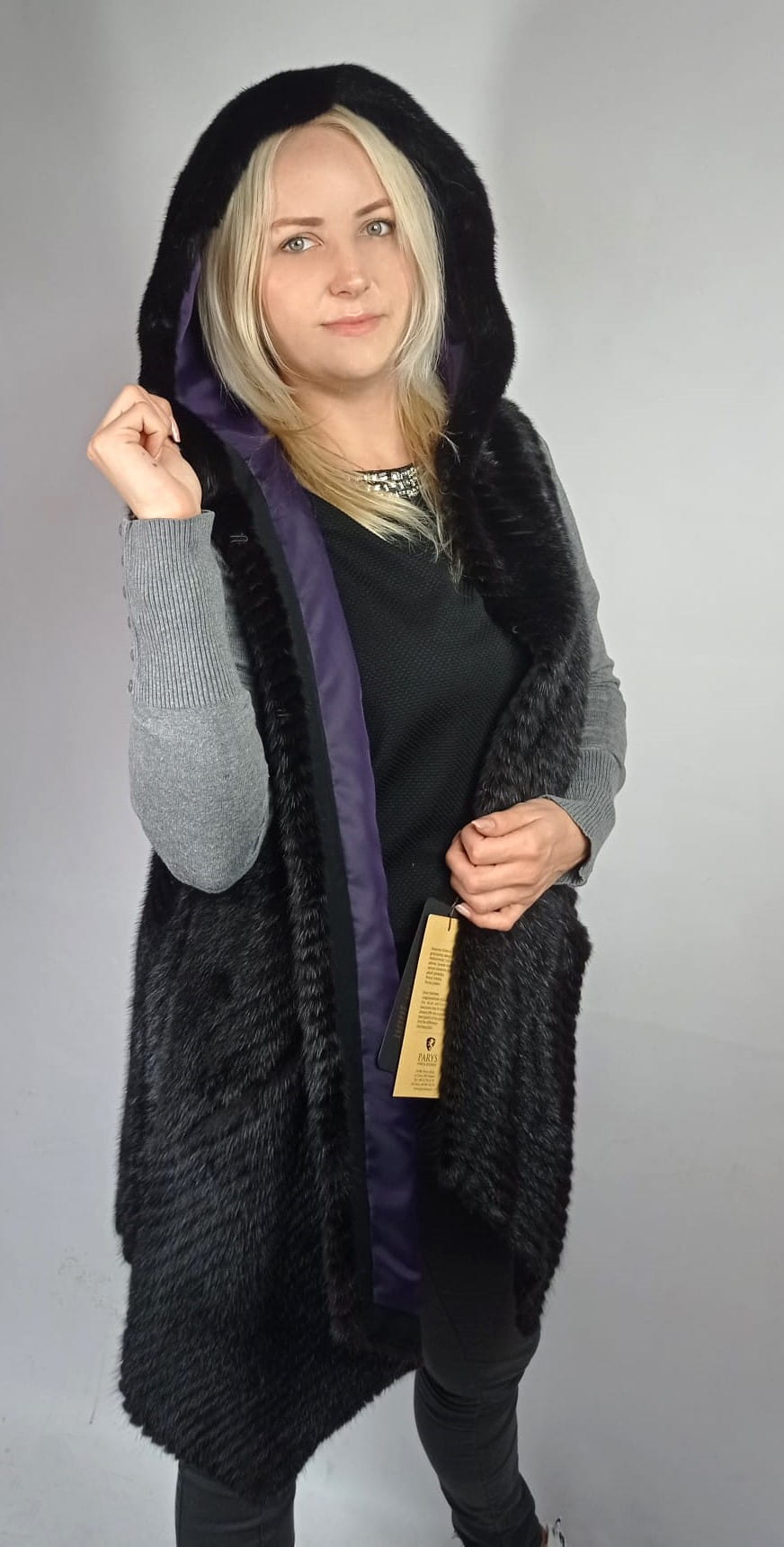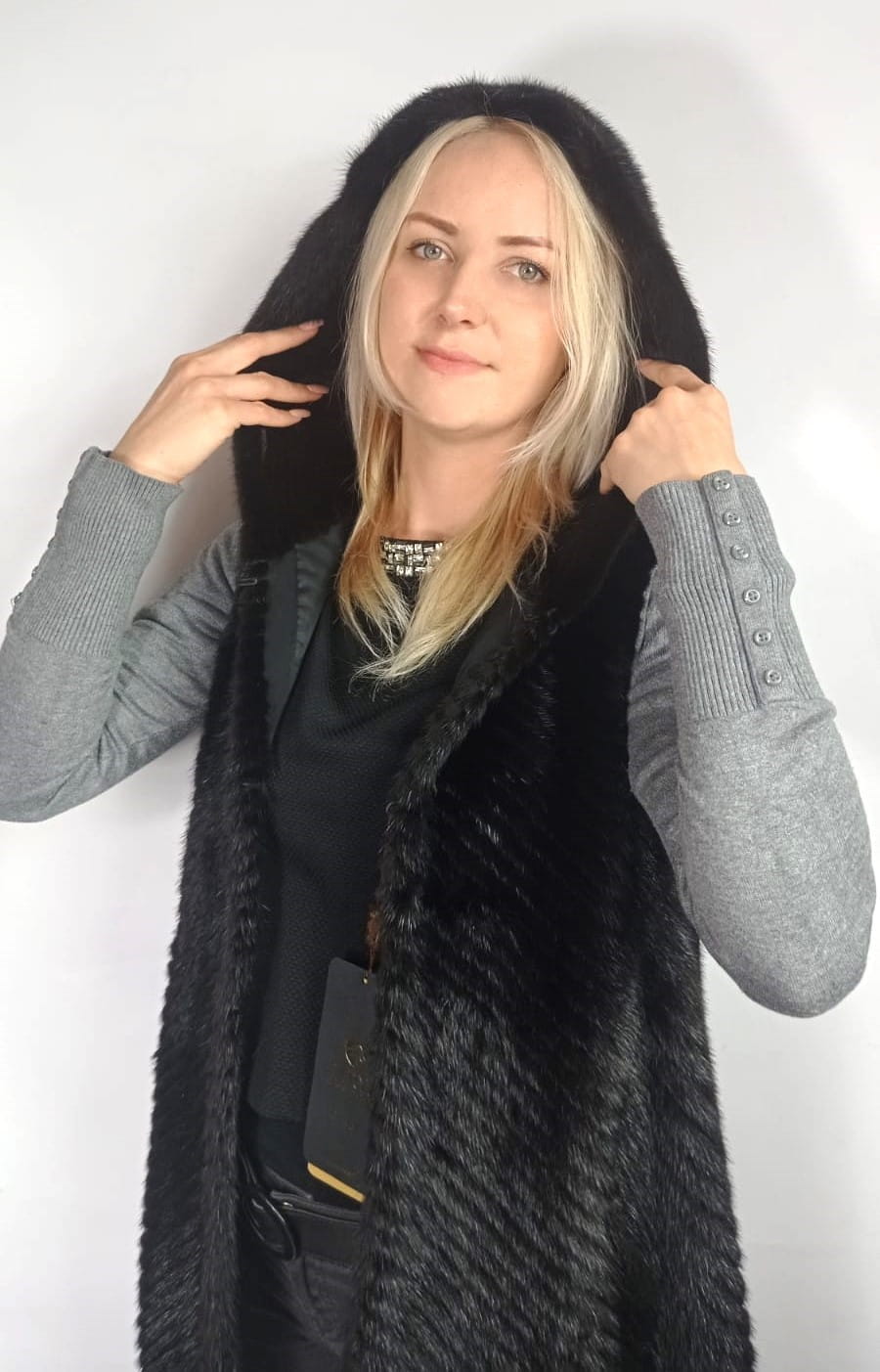 Asymetryczna kamizelka z kapturem wykonana z naturalnego futra grzbietów norczych łączy luksus i nowoczesny design.