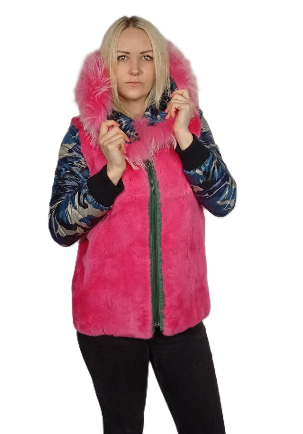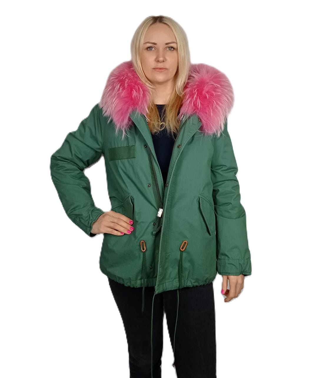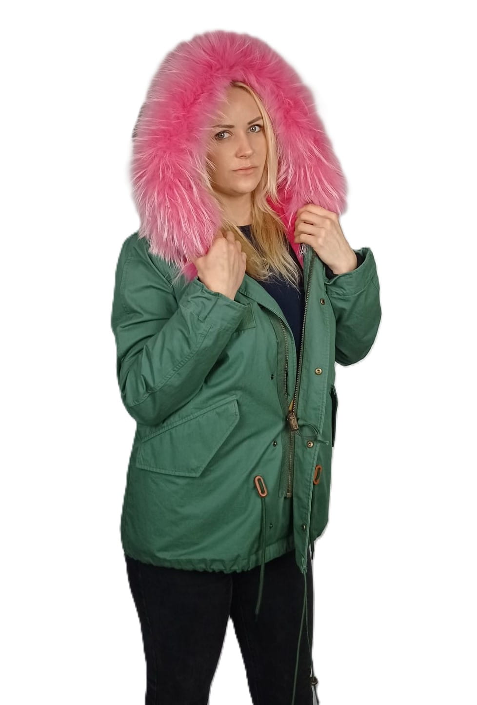 Kaptur kurtki został obszyty naturalnym, pełnym i puszystym futrem z prawdziwego lisa w różowym kolorze z delikatnymi, białymi kosmkami, które nadają całości elegancki i wyrafinowany charakter. Wnętrze zdobi odpinana podszewka z miękkiego futra szopa raccoon w intensywnym, różowym kolorze – wyjątkowo miękka i przyjemna w dotyku, zapewniająca doskonały komfort cieplny.