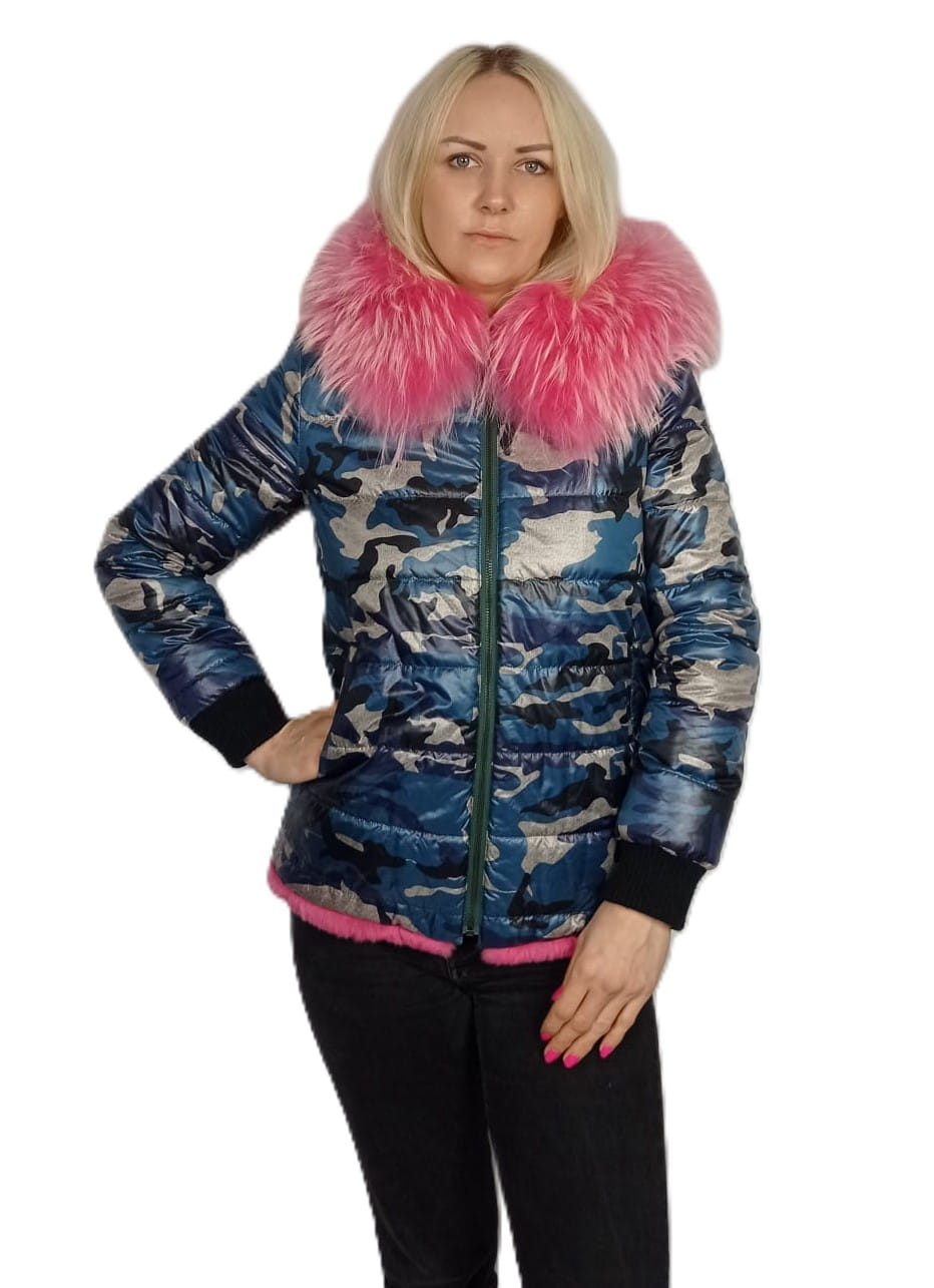 Wewnętrzna kurtka moro – wykonana z materiału przeciwdeszczowego w odcieniach granatu, szarości i czerni. Połączona jest z futrzaną podszewką, dzięki czemu tworzy ciepłą i stylową kurtkę z futrem raccoon, również wyposażoną w kaptur- zapięcie na suwak.