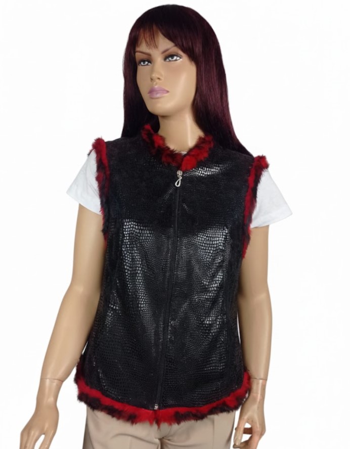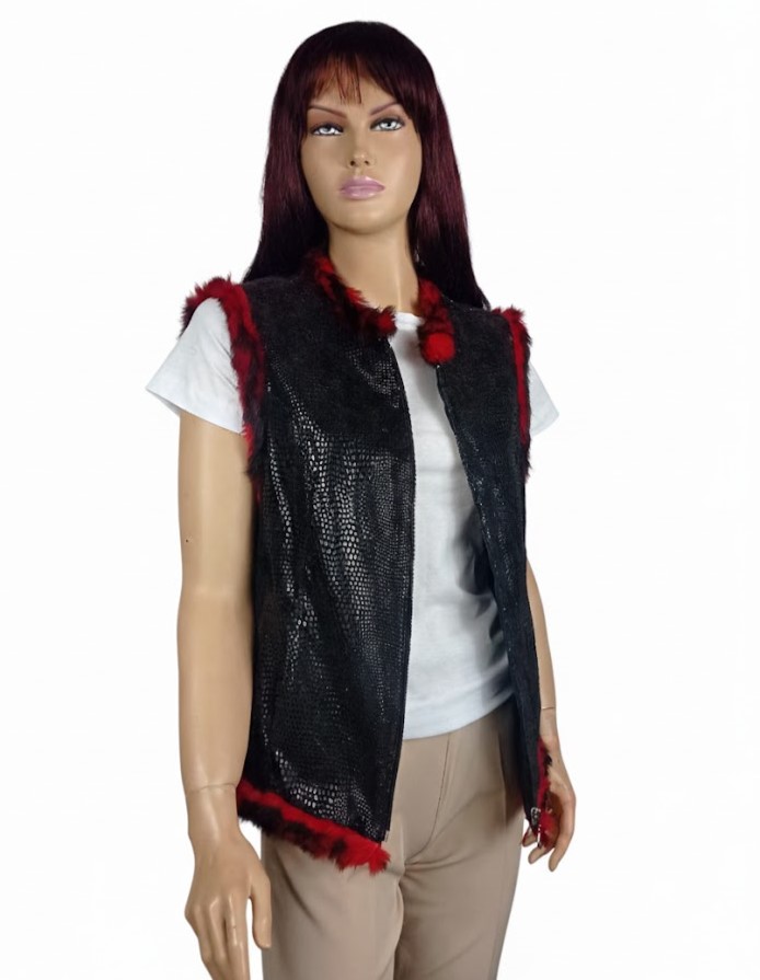 Kamizelka z czerwonymi futrzanymi obszyciami.