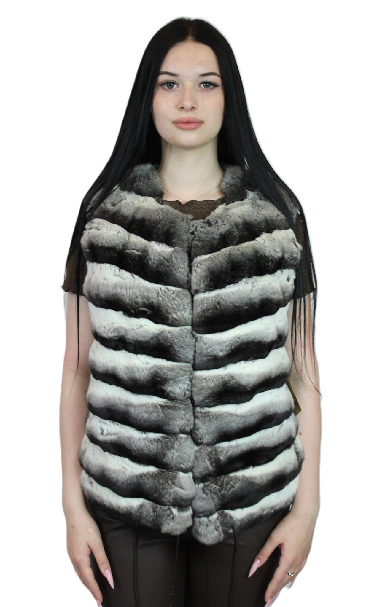 Zjawiskowa kamizelka wykonana z najwyższej jakości naturalnych skór szynszyli w klasycznym odcieniu Chinchilla – subtelnej mieszance szarości, srebra i czerni.