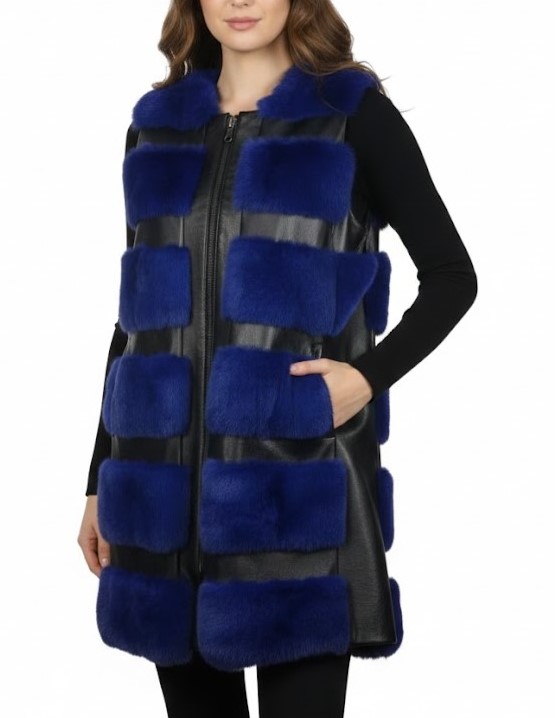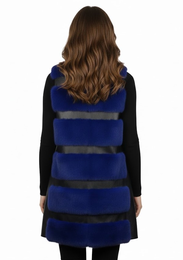 Kobaltowa kamizelka ze skóry naturalnej z futrem z królika Rex