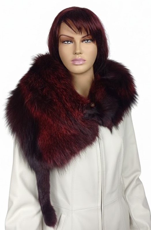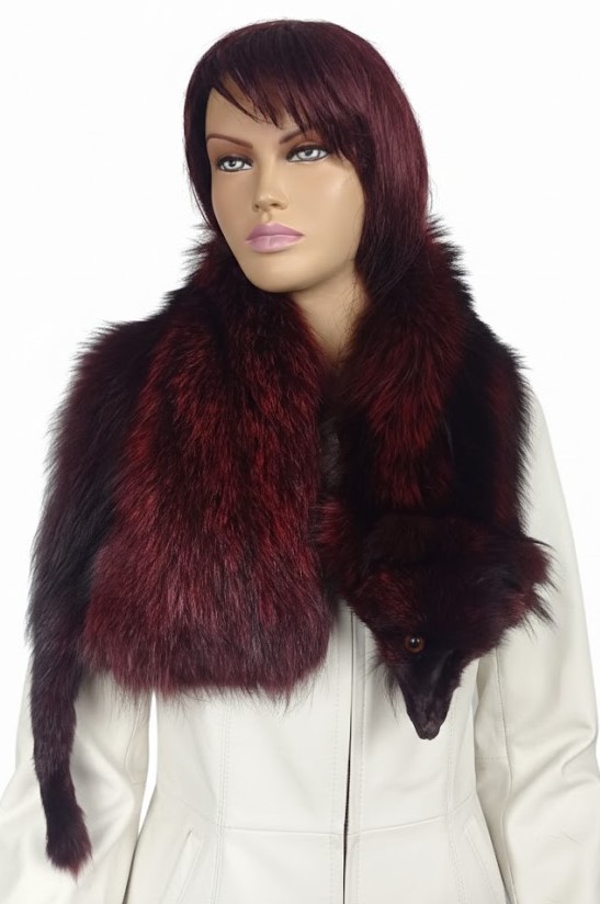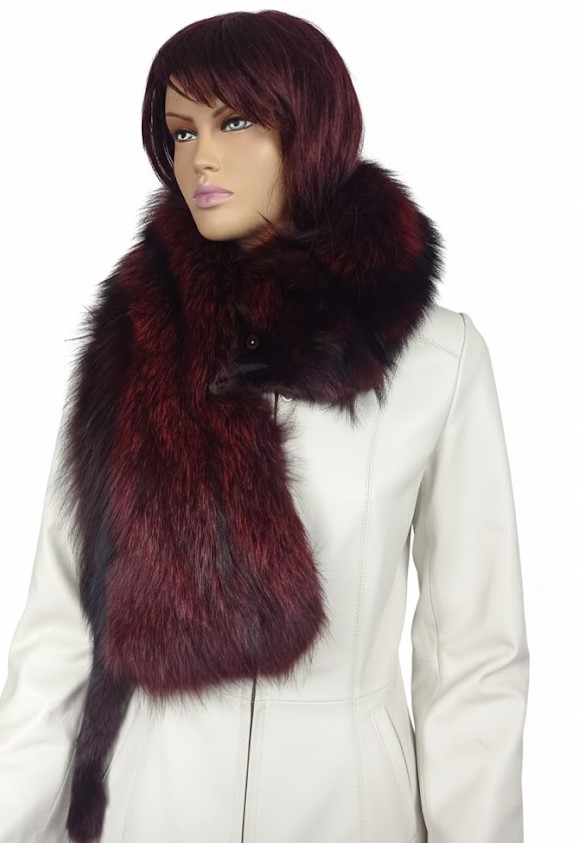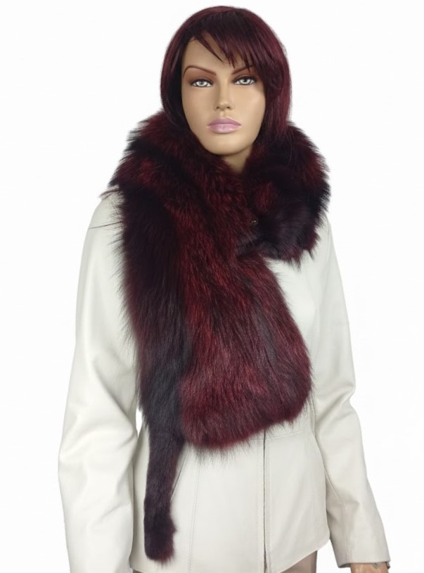 Elegancki kołnierz wykonany z futra lisa farbowanego w głębokim, bordowo-wiśniowym odcieniu.