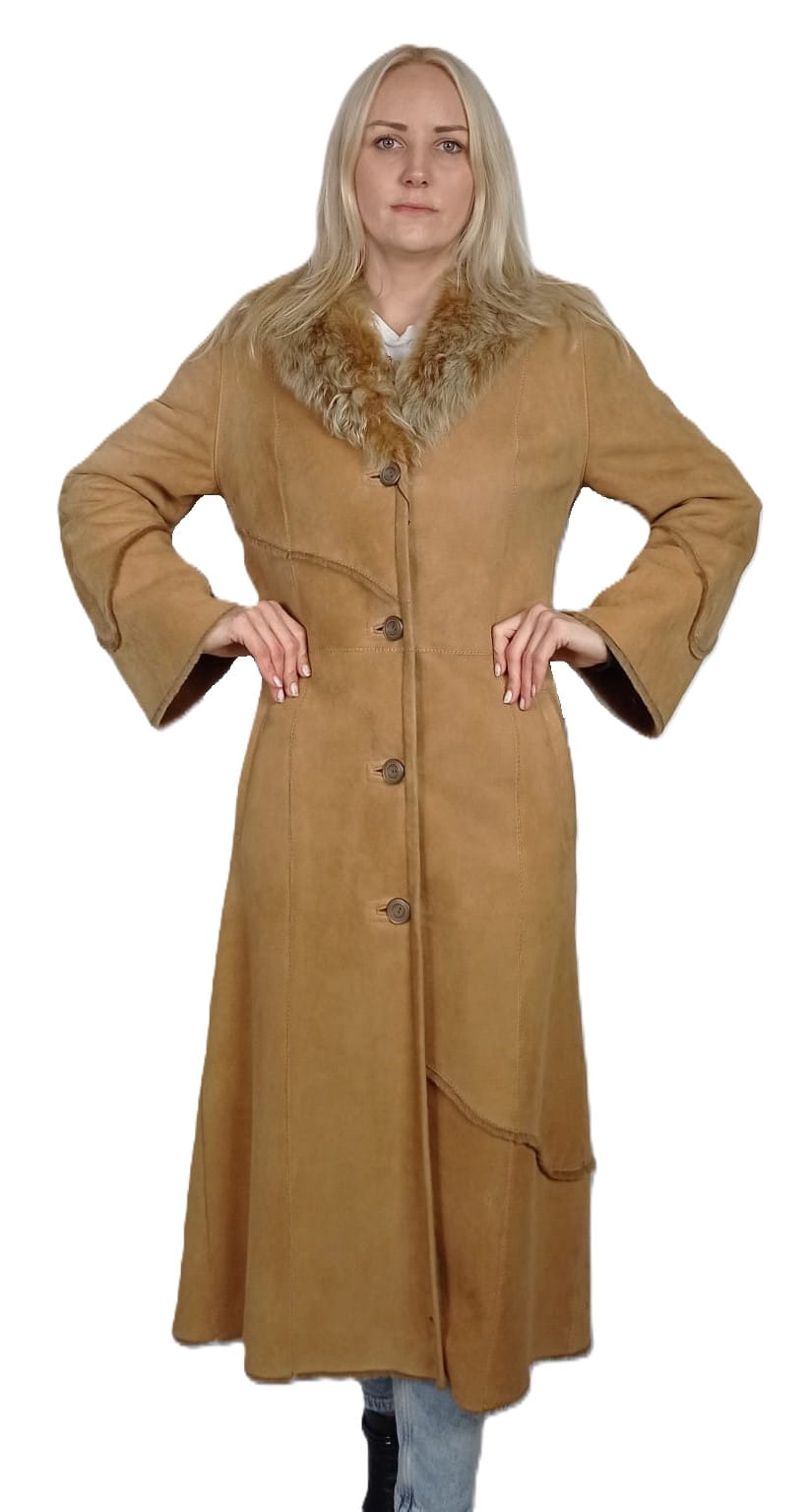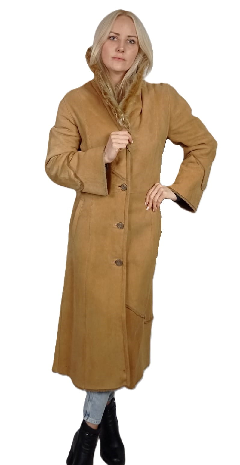 Stylowy i elegancki kożuch wykonany z najwyższej jakości skóry jagnięcej w odcieniu jasnego karmelu.