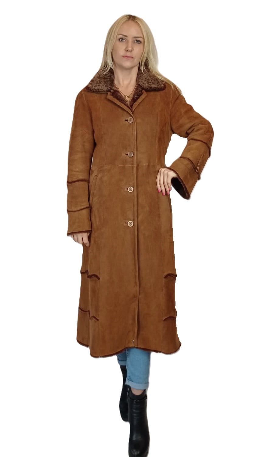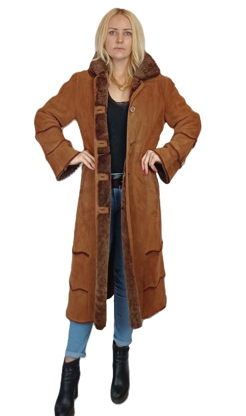 Elegancki długi kożuch damski wykonany z wysokiej jakości naturalnej skóry jagnięcej to propozycja dla osób ceniących klasykę, komfort i trwałość.