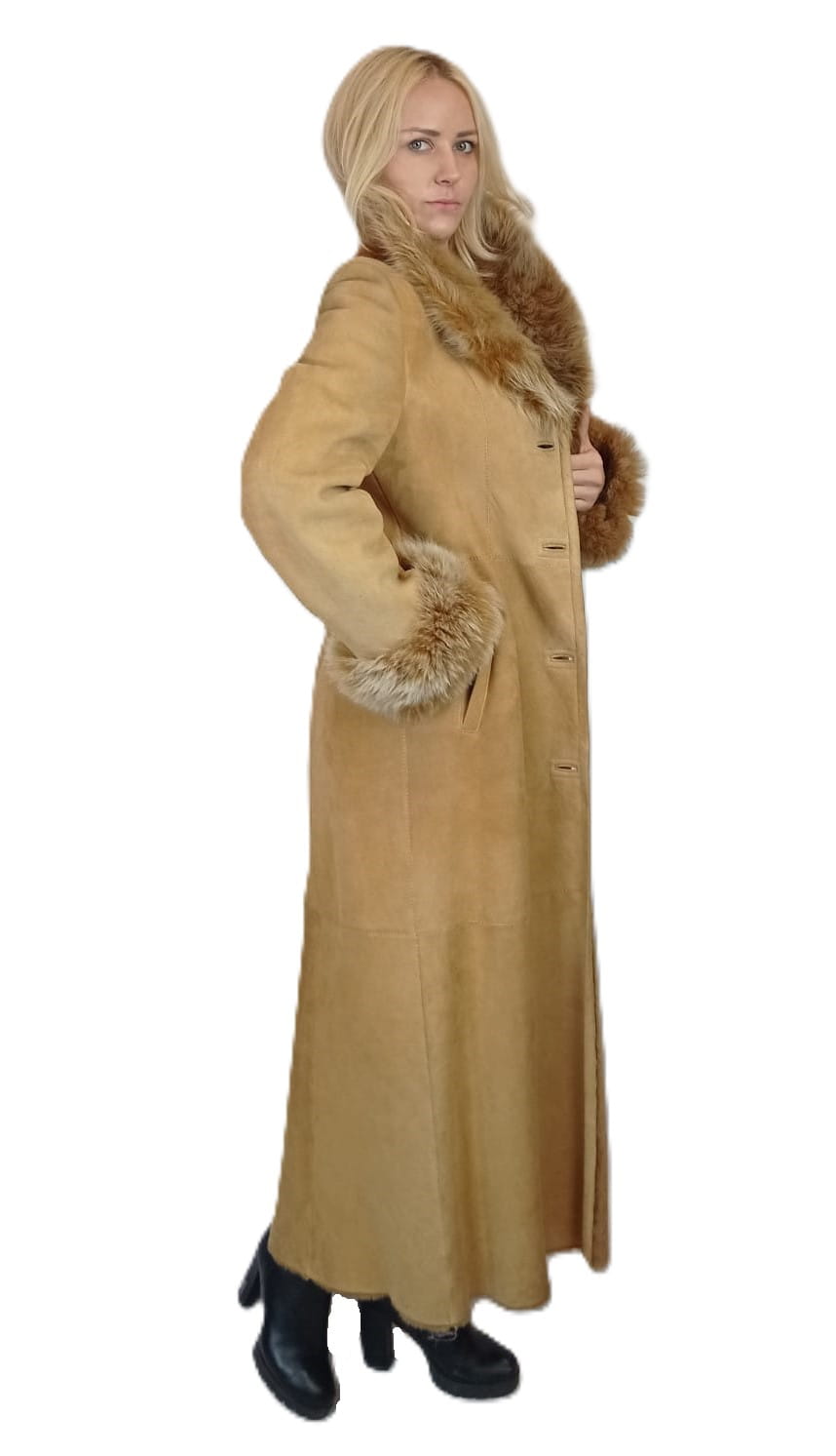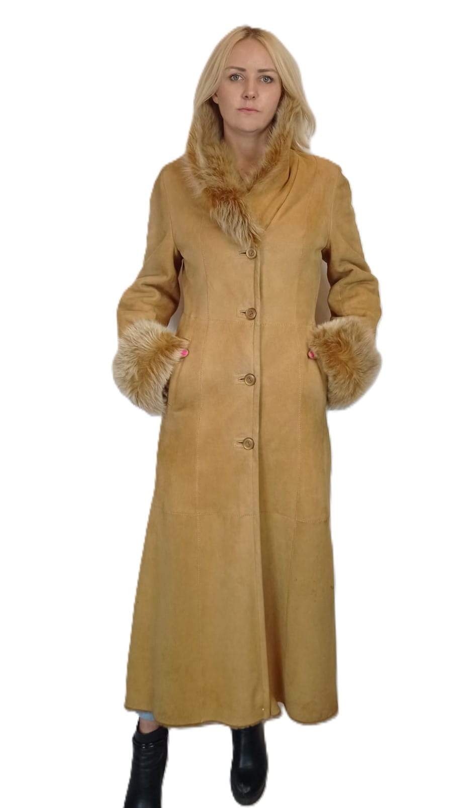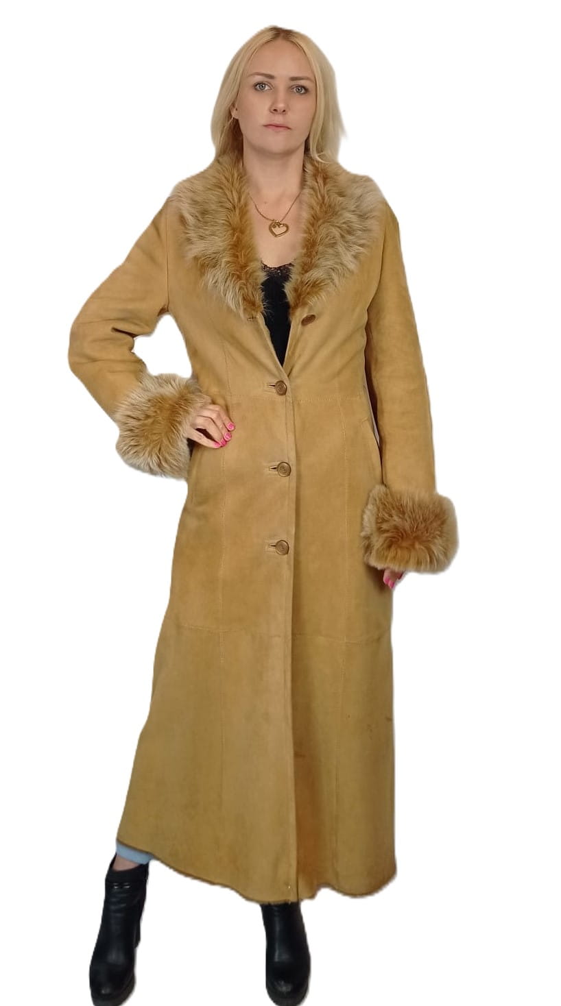 Długi kożuch damski z naturalnej skóry z futerkiem.