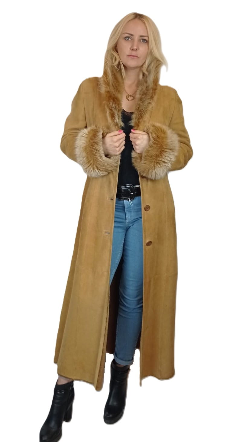 Elegancki, długi kożuch wykonany z wysokiej jakości naturalnej skóry w ciepłym odcieniu karmelu.