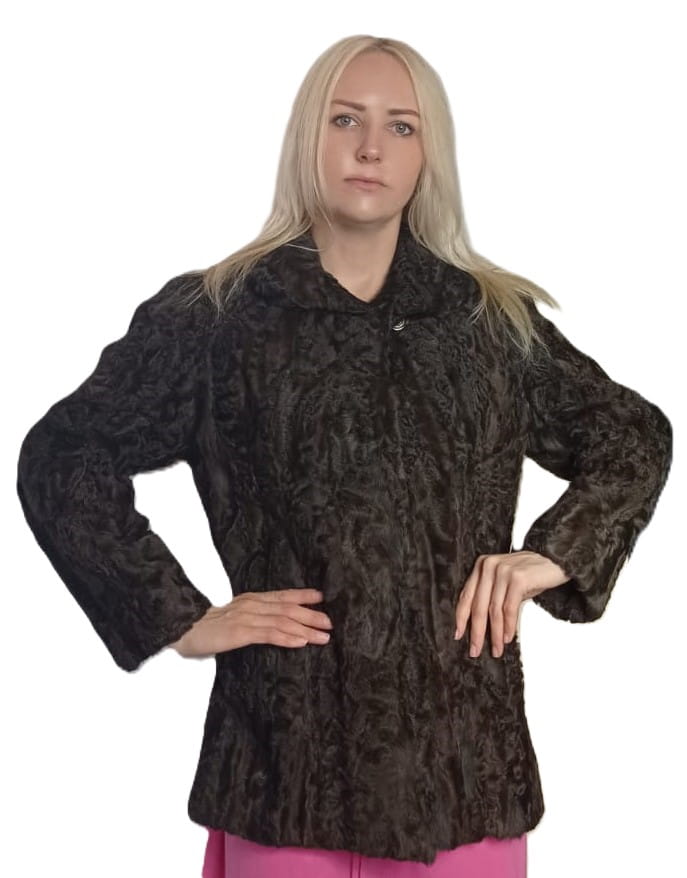 Kurtka wykonana z naturalnych karakułów w klasycznym, prostym fasonie, który podkreśla ponadczasowy charakter materiału.