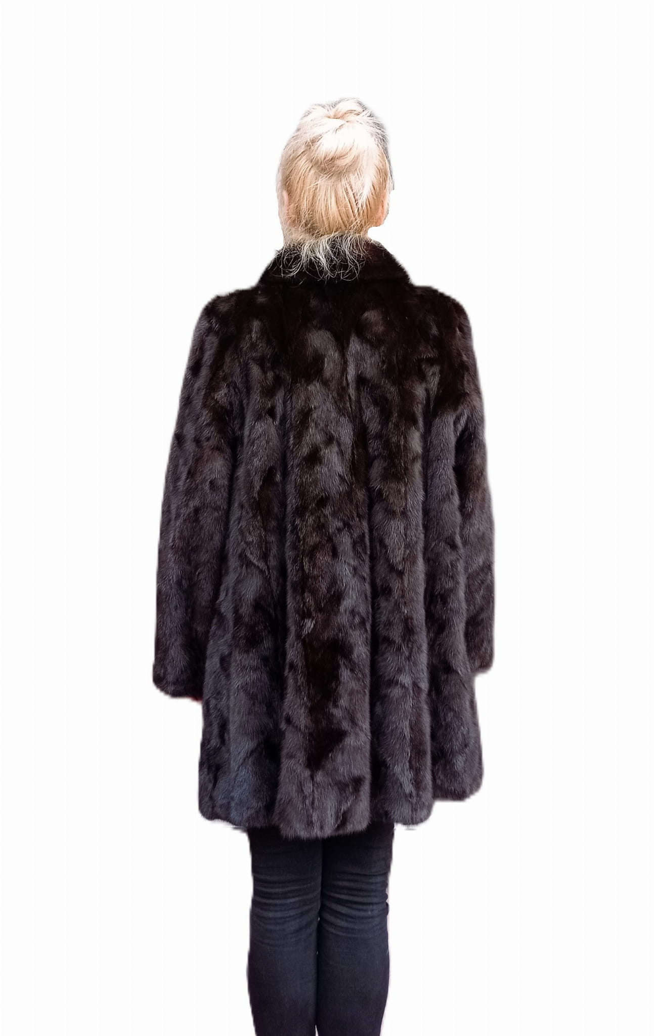 Szczególną uwagę przyciąga efektowny kołnierz wykonany z grzbietów norczych, który dodaje całości wyrafinowanego charakteru.