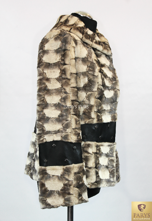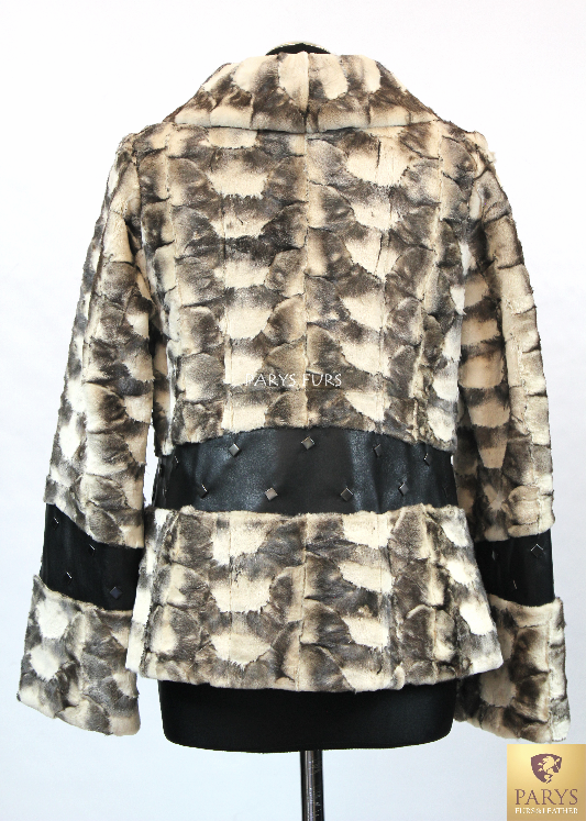 Model wyróżnia się ozdobnymi przeszyciami w pasie i na rękawach, wykonanymi ze skóry, zdobionej metalowymi nitami.