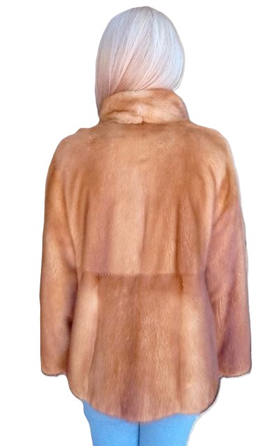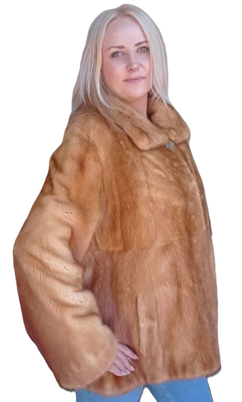 Kurtka została wykonana z najwyższej jakości naturalnego futra norek w klasycznym, ciepłym odcieniu bursztynowym.