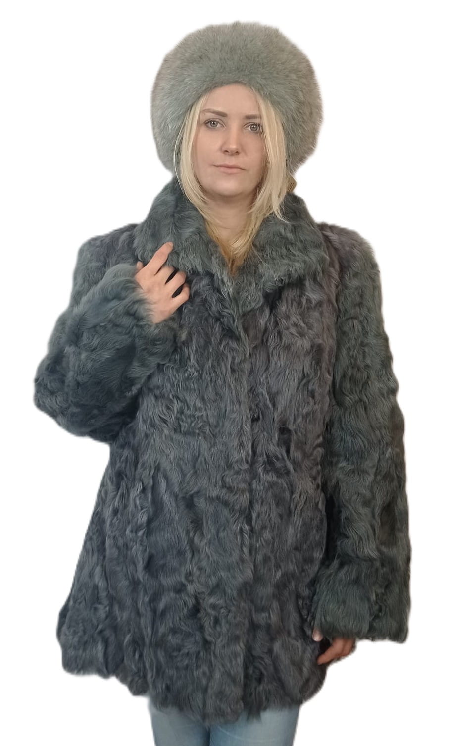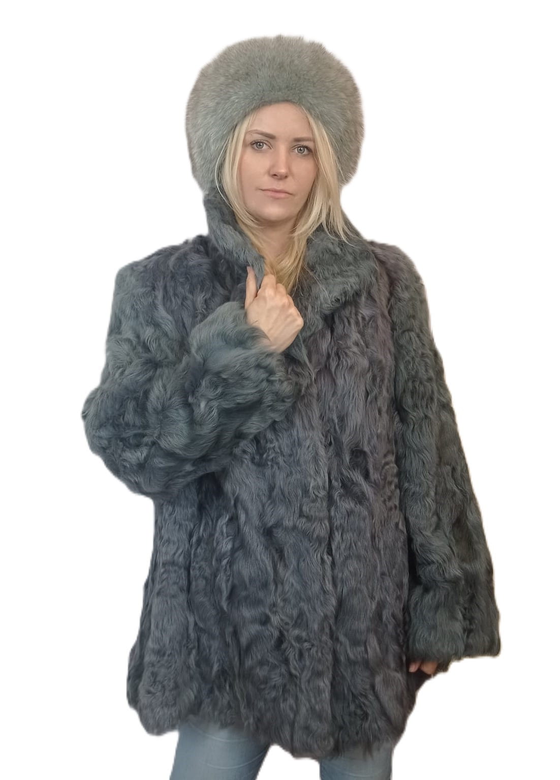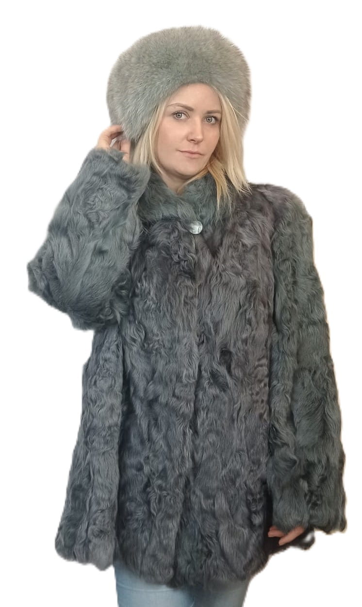 Damska kurtka wykonana z naturalnego futra kozic w wyjątkowym kolorze ciemnego srebra.