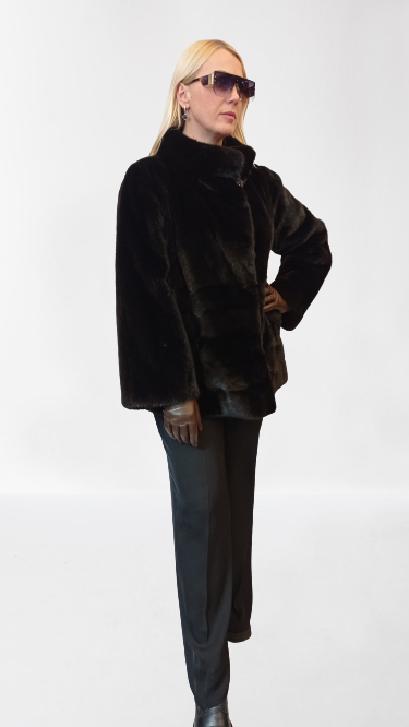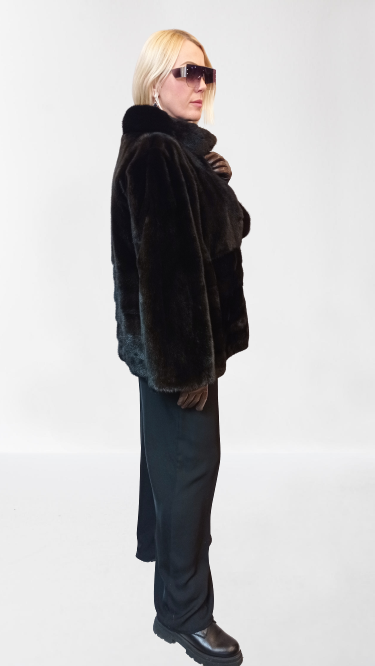 Piękna, luksusowa kurtka wykonana z najwyższej jakości naturalnego futra norek, pochodzącego z grzbietów (tzw. grzbiety norcze), w odcieniu klasycznej, czerni Mink Female Black.