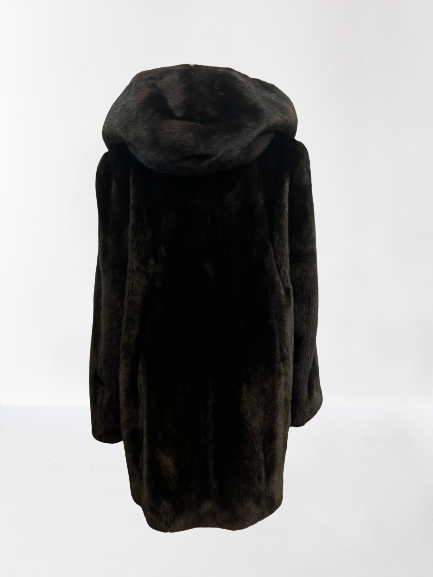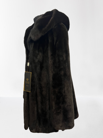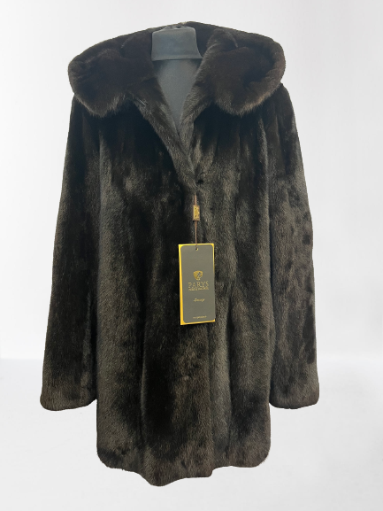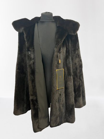 Kurtka jest z paskiem, posiada duży kaptur, po bokach niewielkie rozcięcia.
