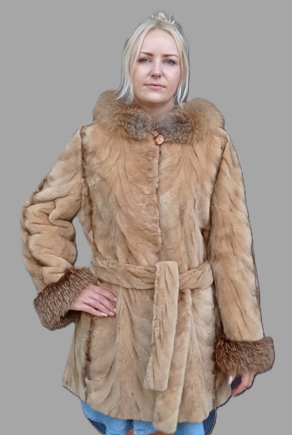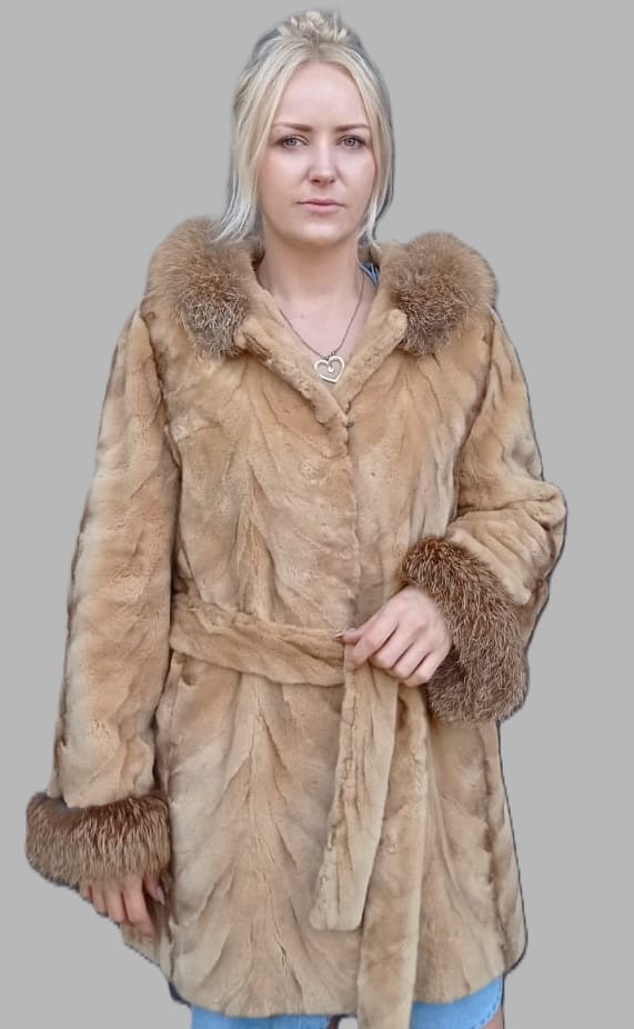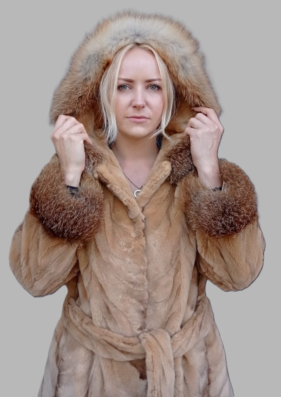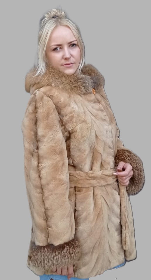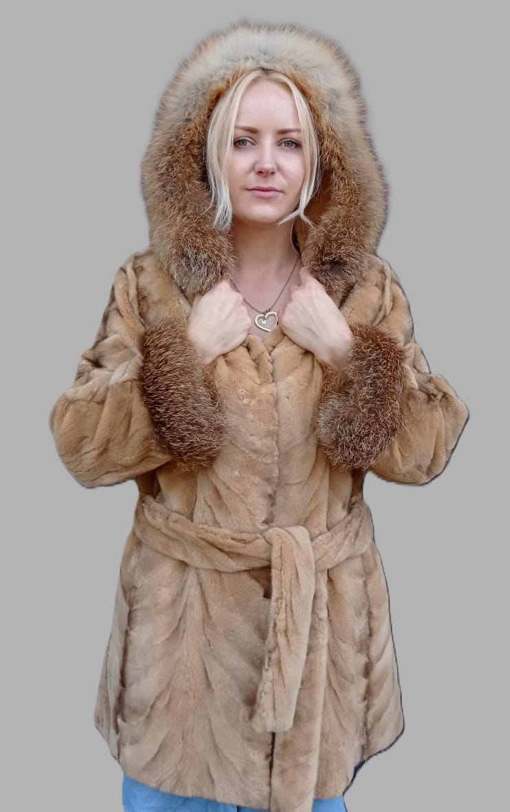 Stylowa kurtka z kawałków norki z efektownym kapturem i mankietami obszytymi luksusowym lisem.