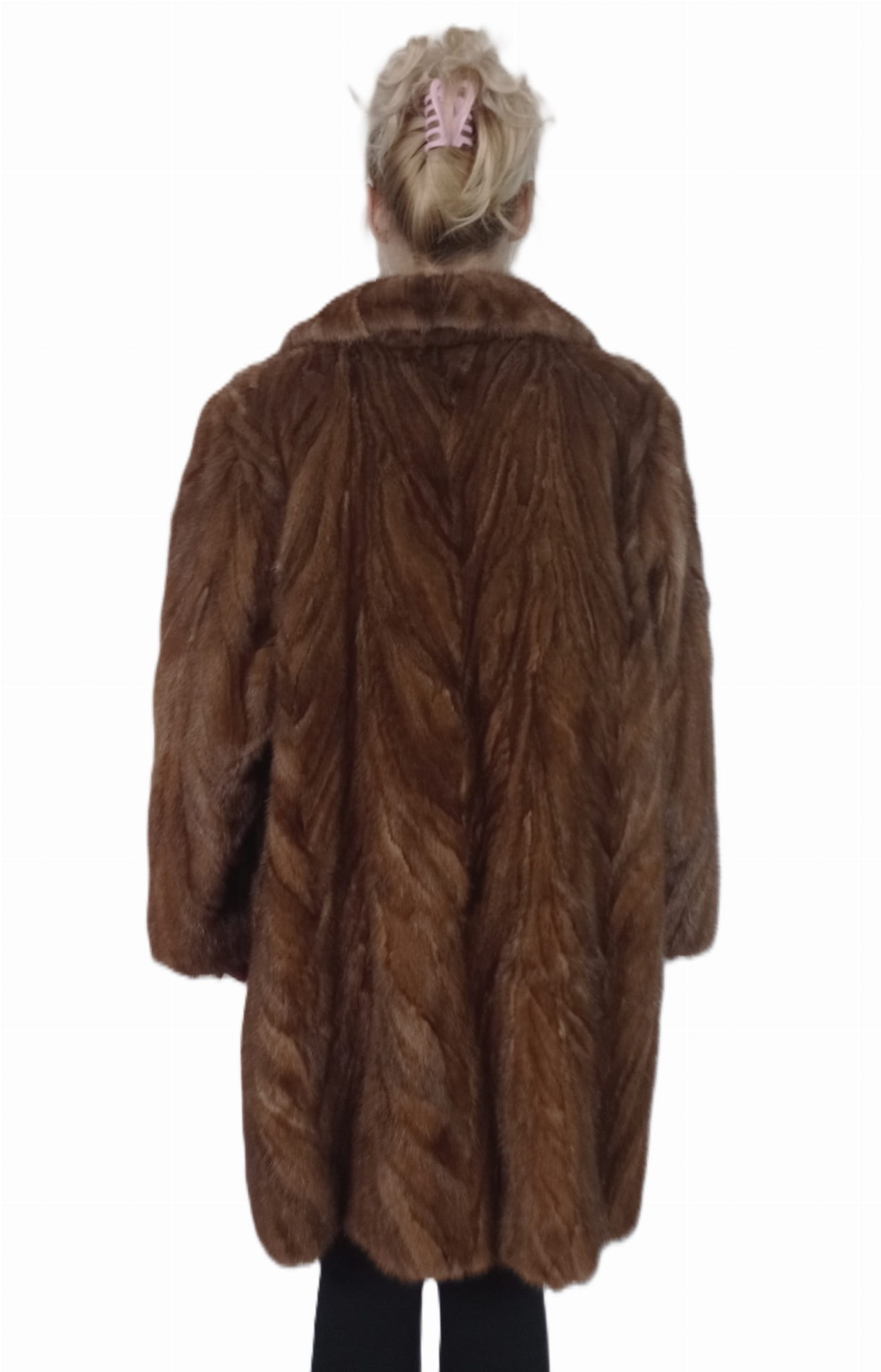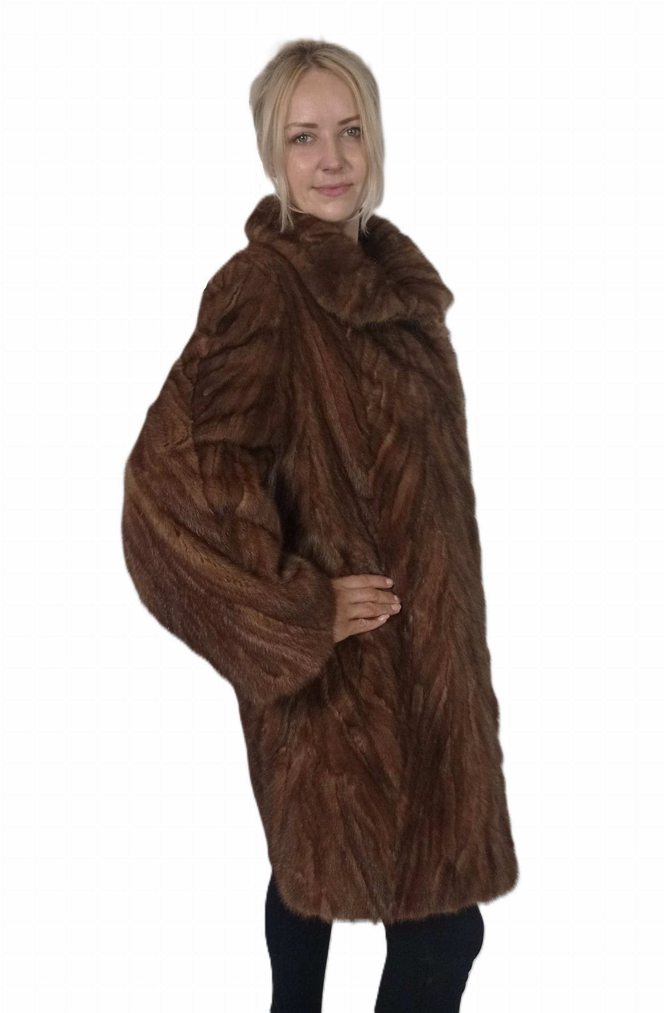 Wyjątkowe futro wykonane z precyzyjnie zszywanych kawałków naturalnego futra norek w ponadczasowym odcieniu brązu.