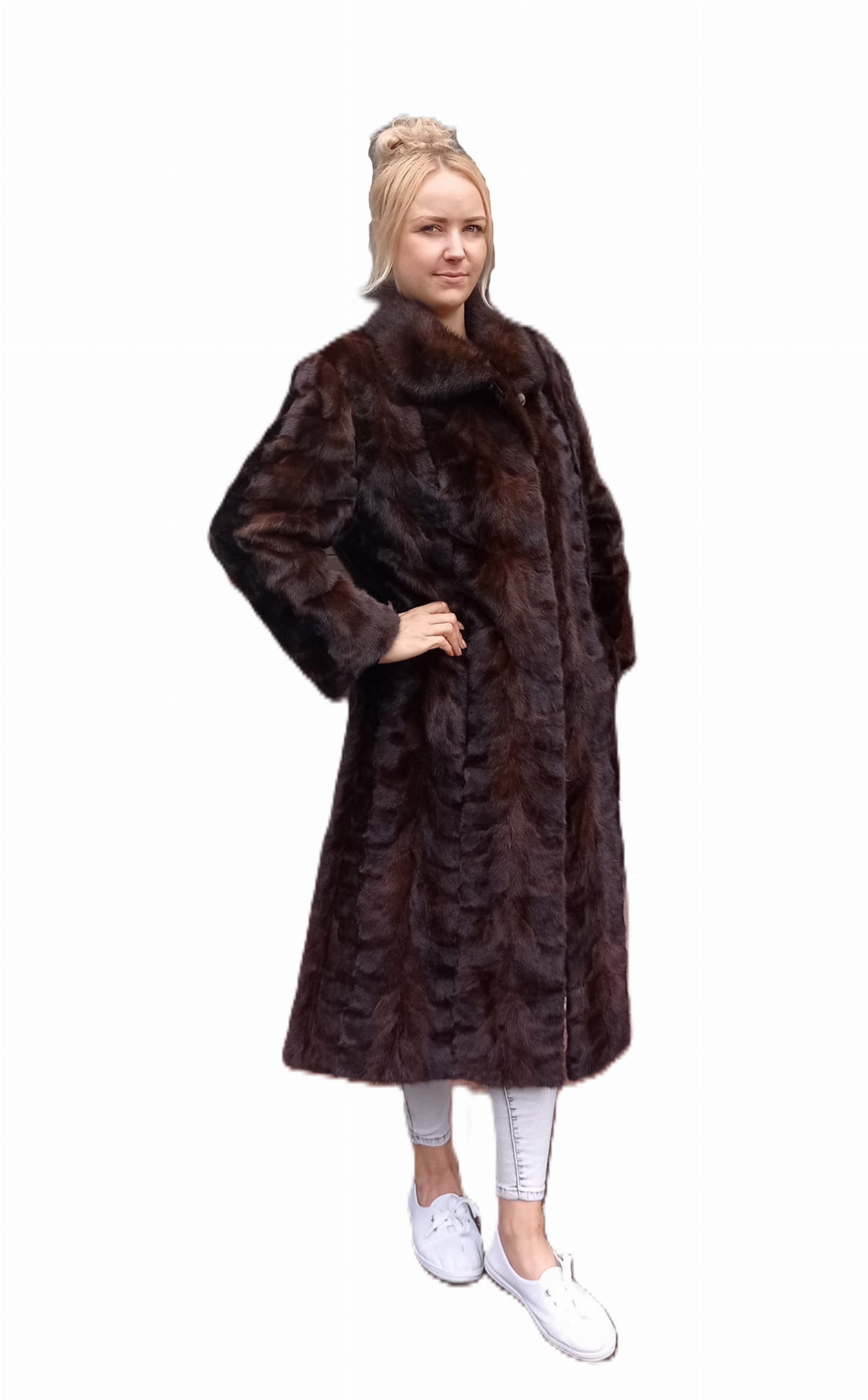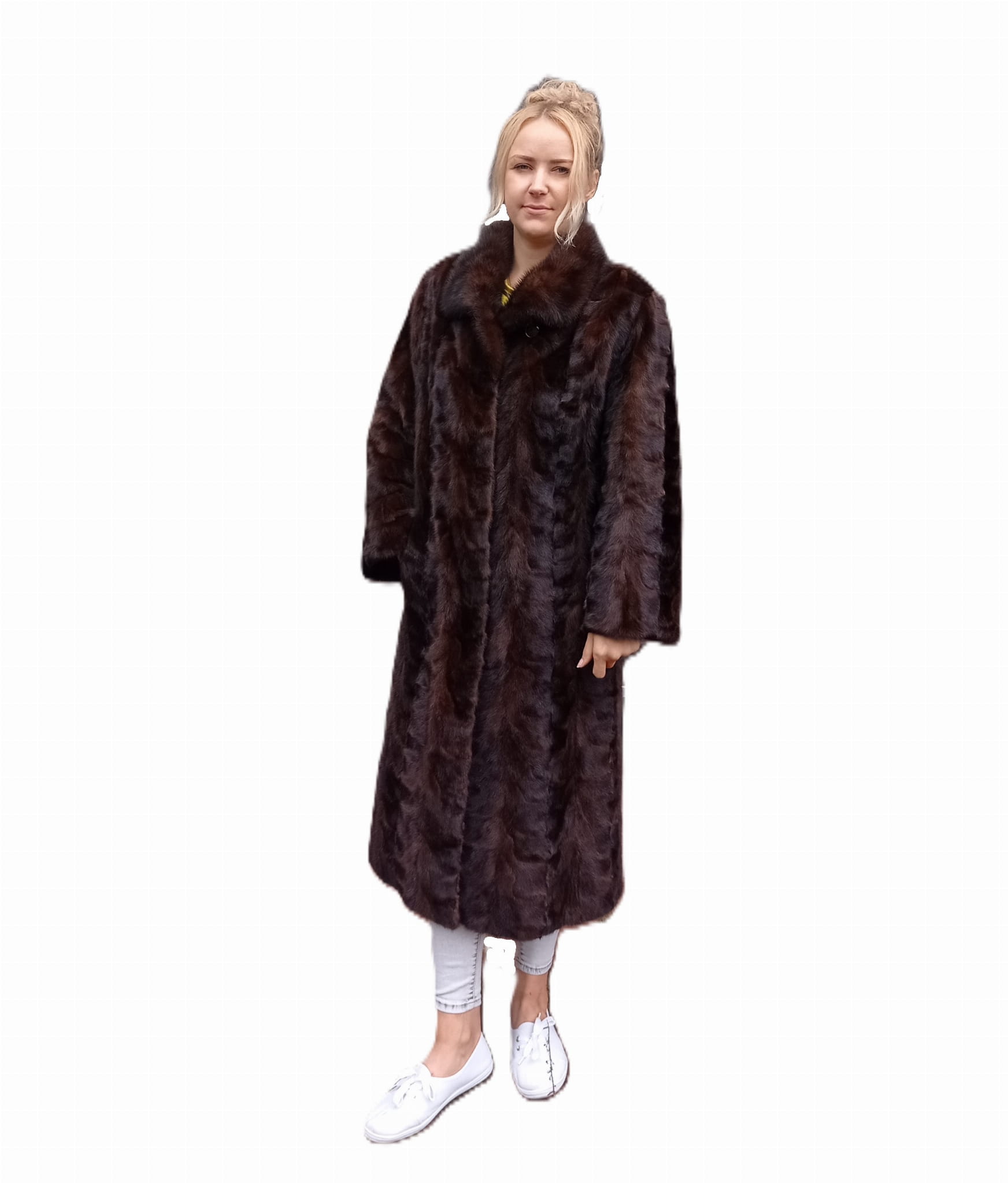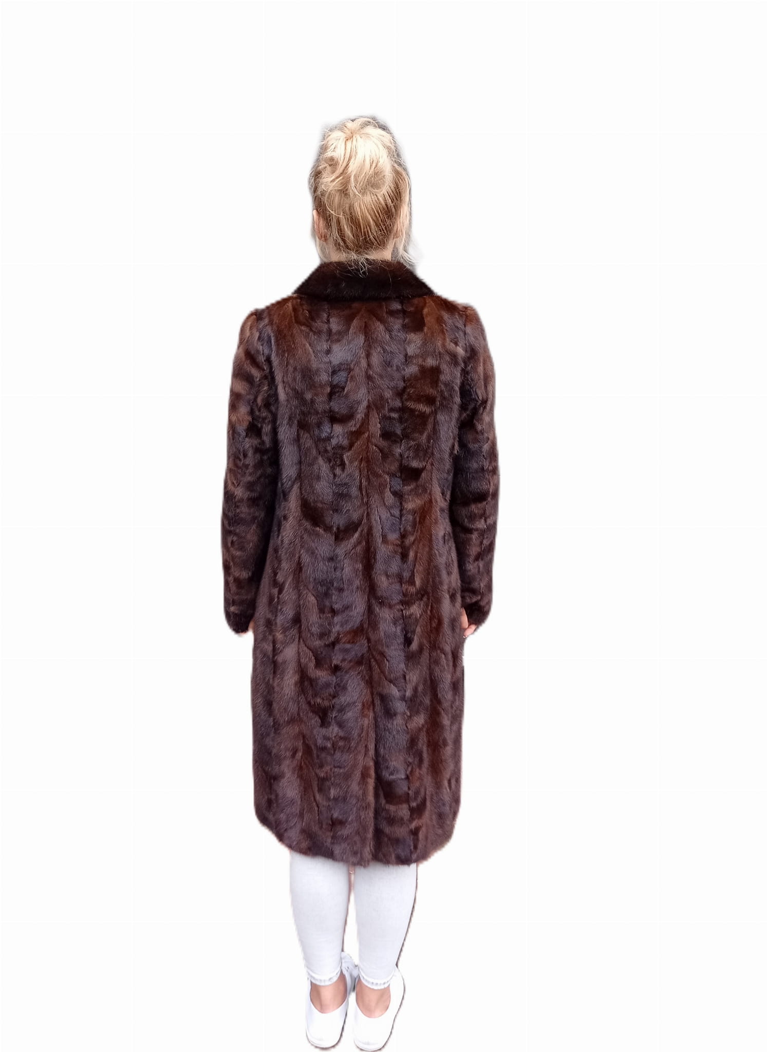 Wyjątkowy płaszcz wykonany z wysokogatunkowego futra norek w kolorze ciemnego brązu.