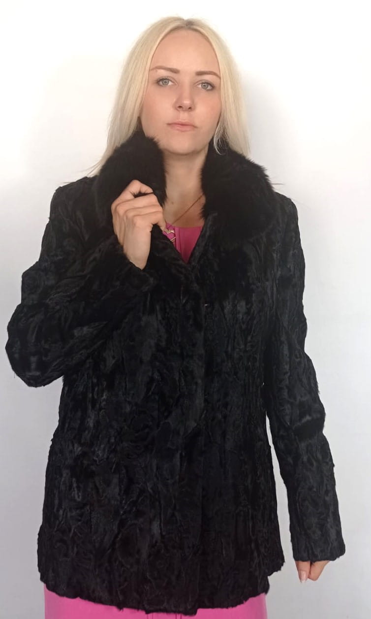 Kurtka wykonana z naturalnego futra karakułów, z kołnierzem z futra lisa.