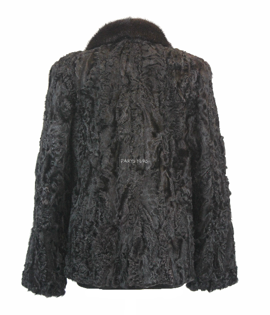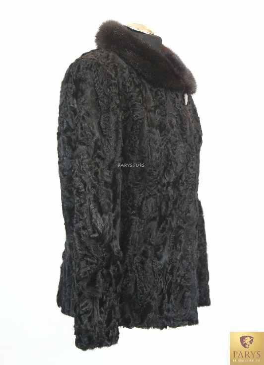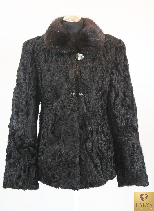 Kurtka wykonana z naturalnego futra karakułów, z kołnierzem z futra lisa.