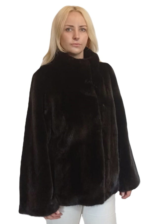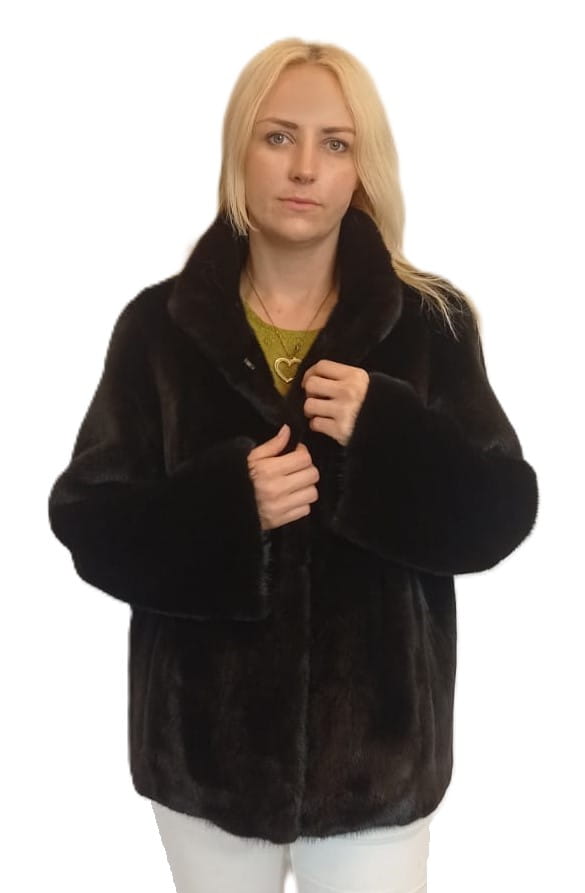 Krótka kurtka damska wykonana z luksusowego naturalnego futra norek w głębokim, czarnym odcieniu.