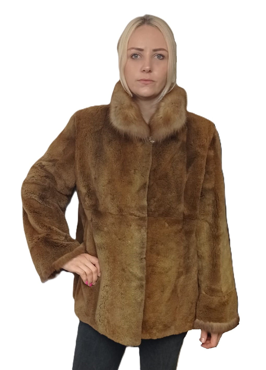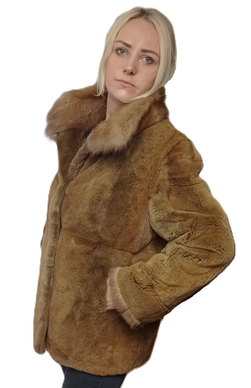 Kurtka wykonana z naturalnego futra epilowanej norki w ciepłym, karmelowym odcieniu.