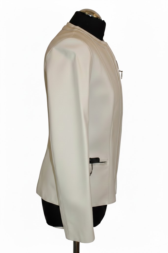 Szlachetny odcień złamanej bieli pięknie komponuje się zarówno z eleganckimi spodniami, jak i sukienką.