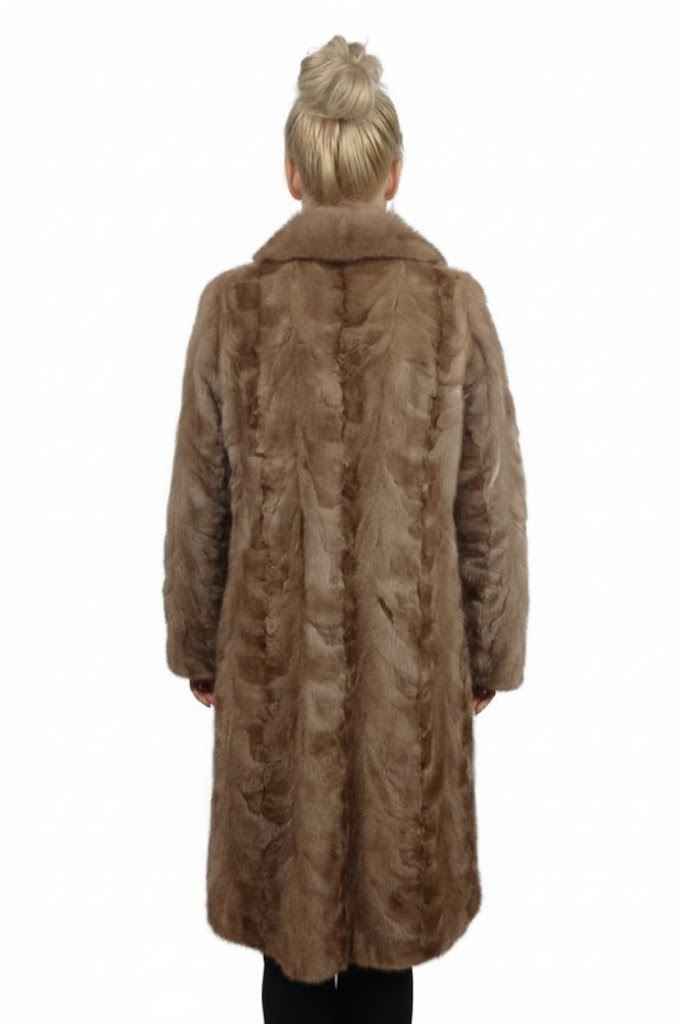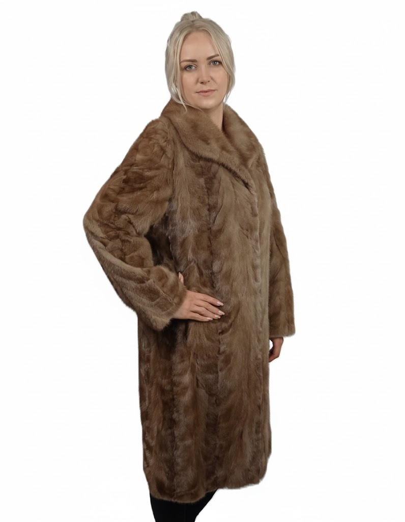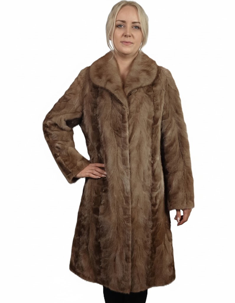 Futro posiada stylowy kołnierz otulający szyję oraz klasyczny, lekko dopasowany krój, który pięknie podkreśla sylwetkę.