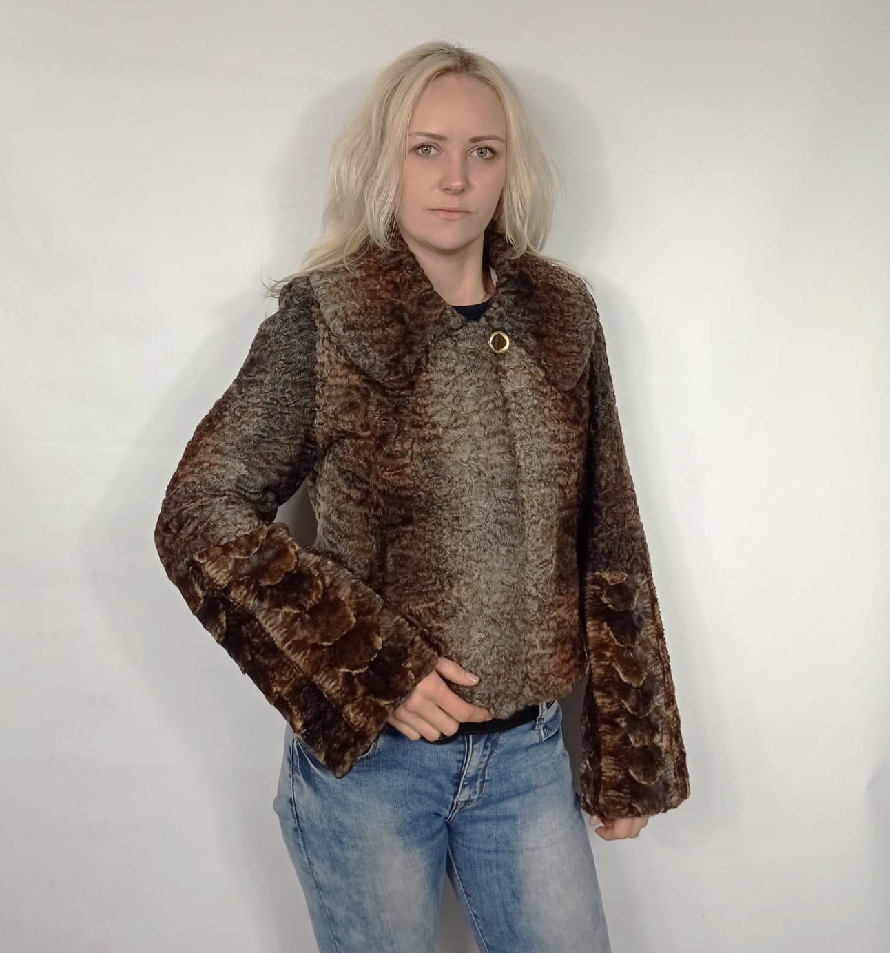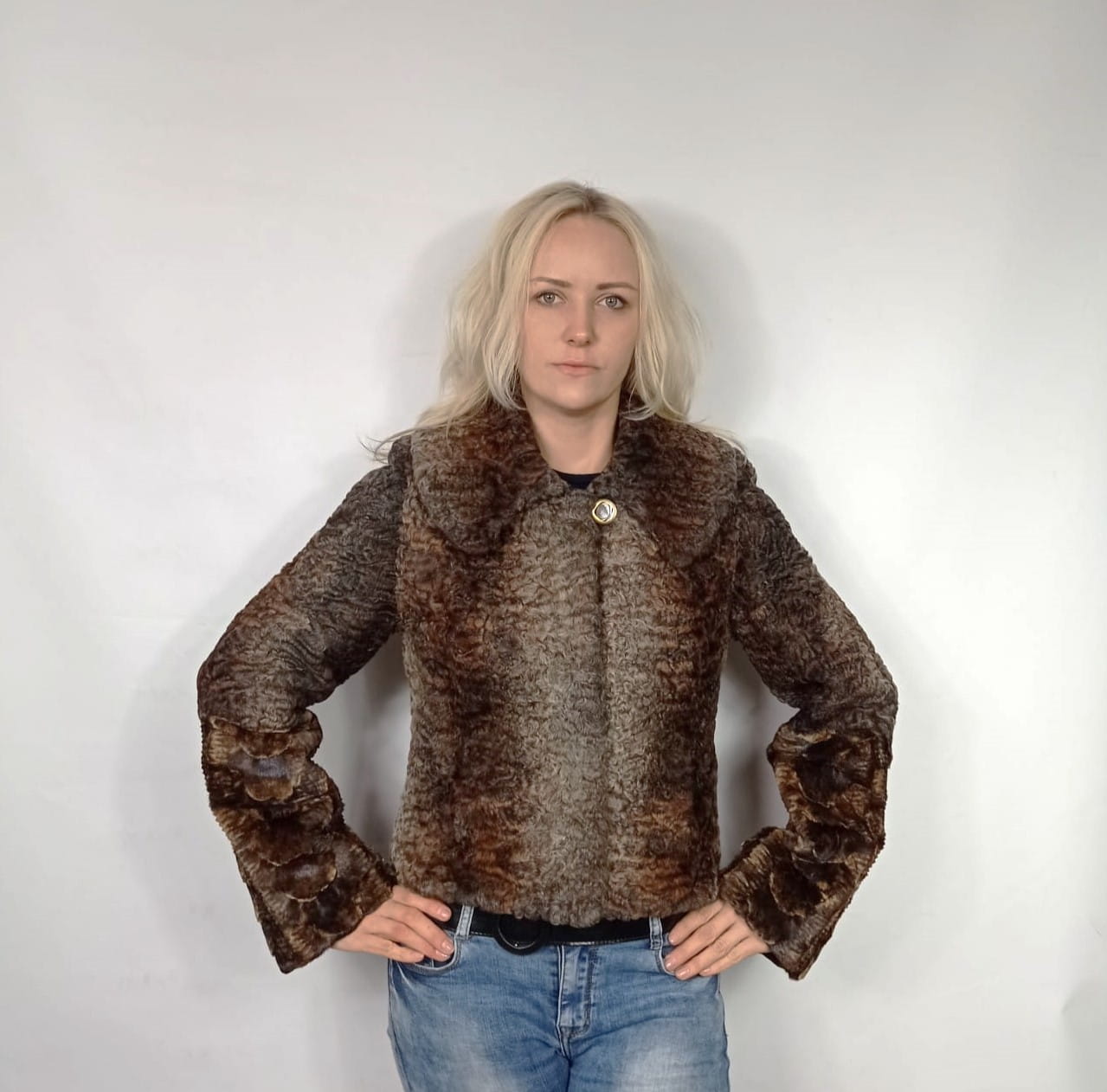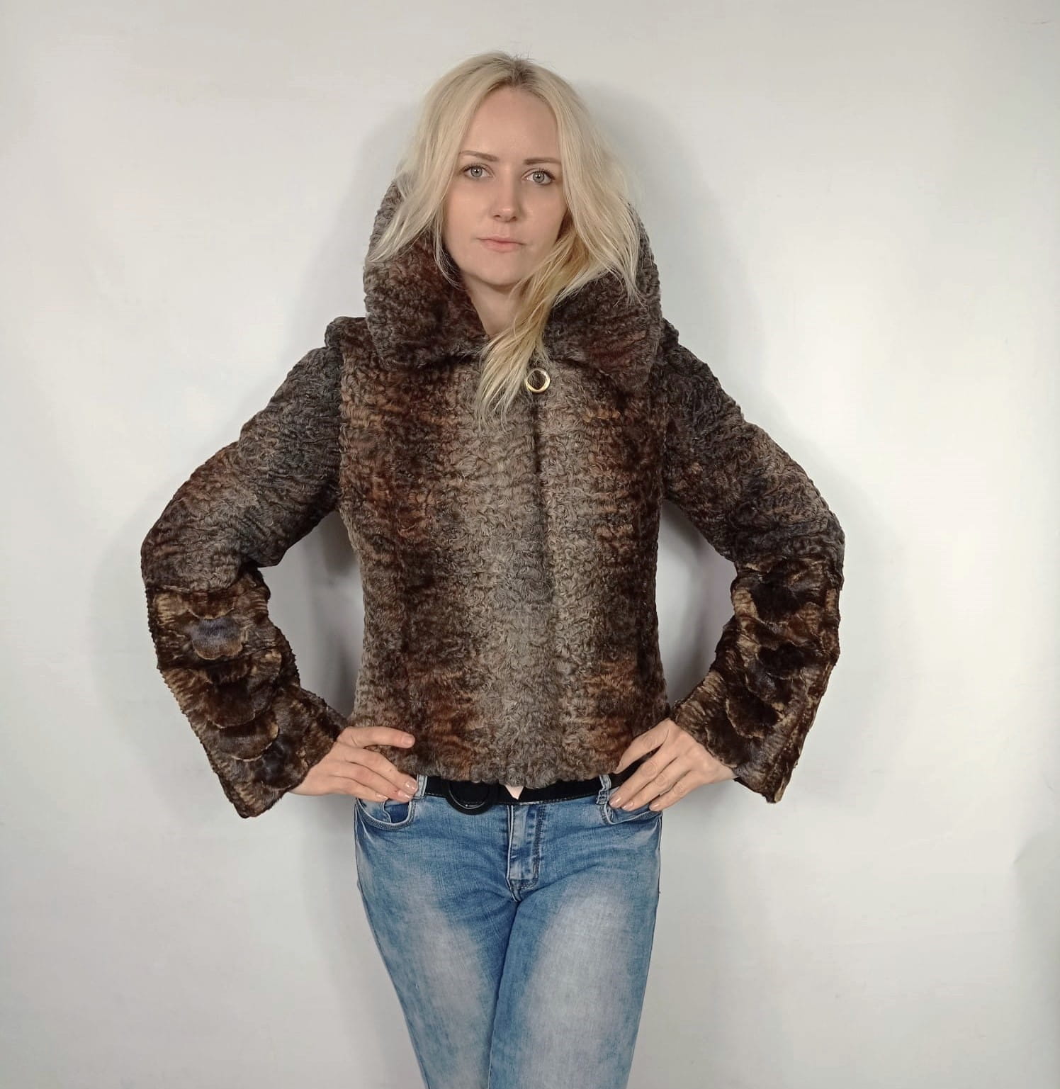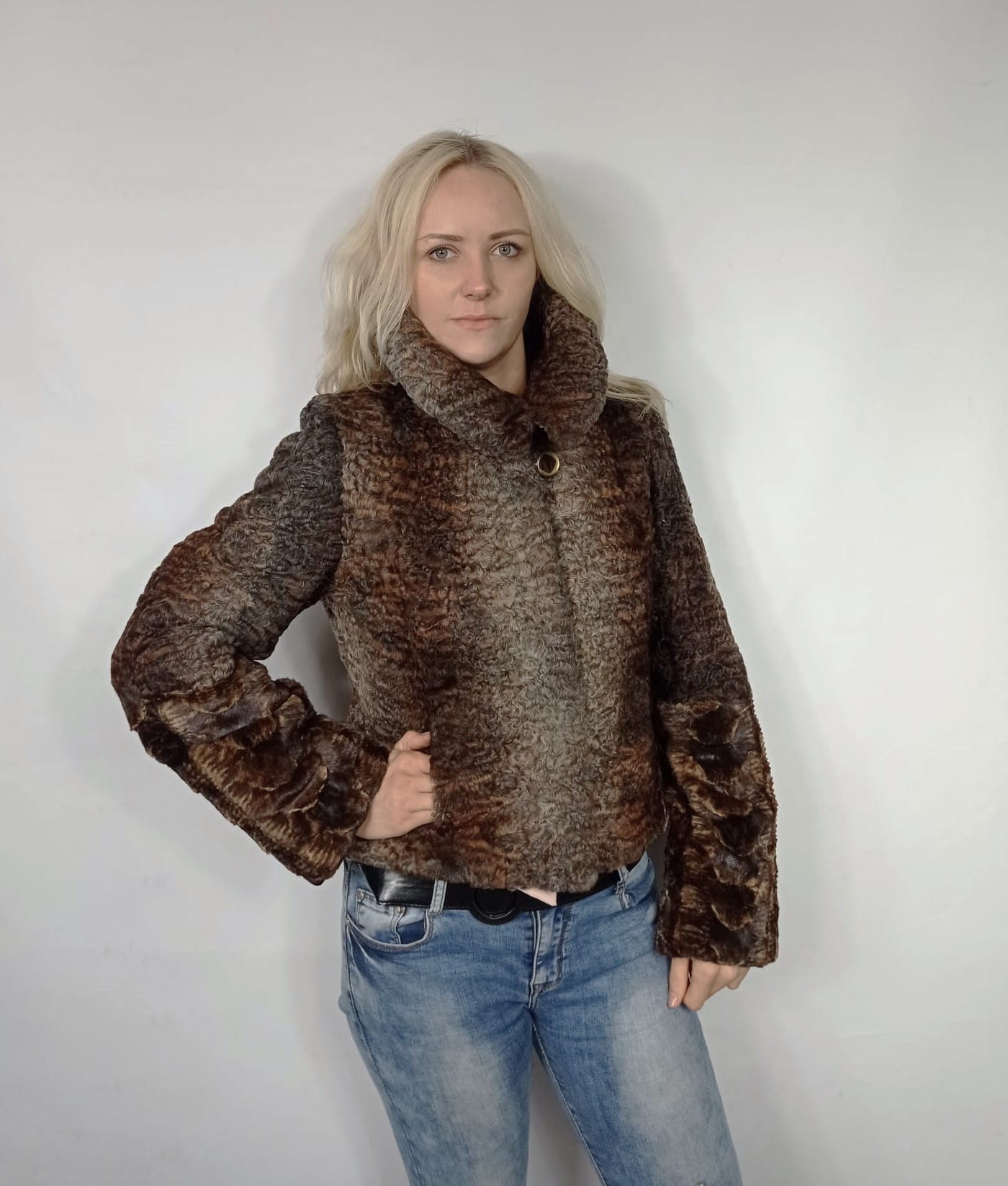 Damska kurtka wykonana z naturalnego futra karakuł zachwyca szlachetnym połączeniem odcieni jasnego i ciemnego brązu, tworząc efektowny, głęboki kontrast.