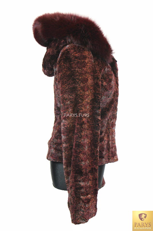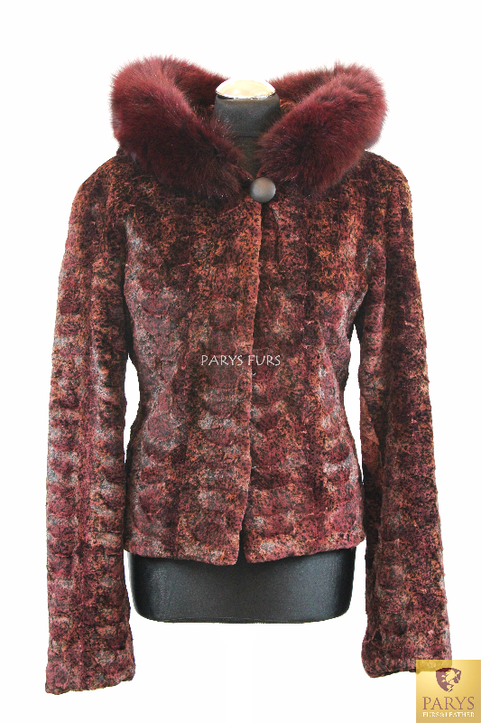 Elegancka i przyciągająca wzrok kurtka wykonana z naturalnego futra norek w odcieniu burgundu, subtelnie przełamanym brązowymi stemplowaniami.