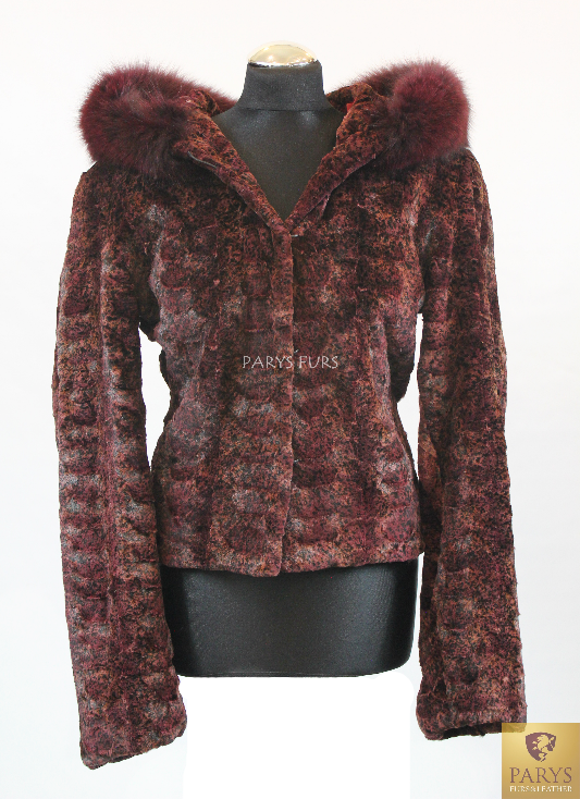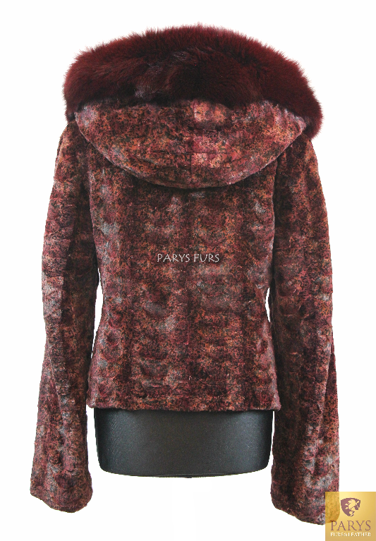 Damska kurtka z naturalnego futra norek z kapturem wykończonym lisem – burgund z brązowym cieniowaniem