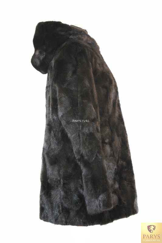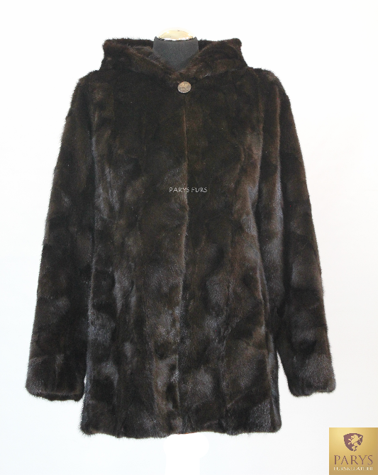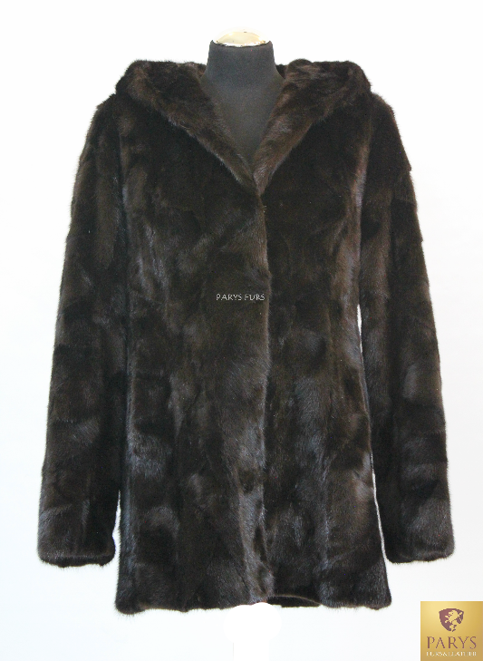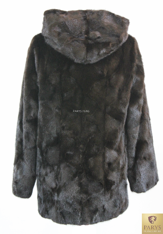 Damska kurtka NASTKA z kapturem – naturalne futro norek, ciemny brąz.