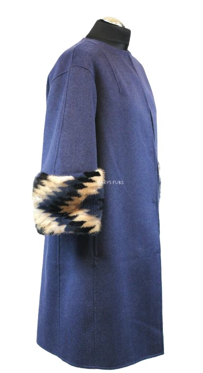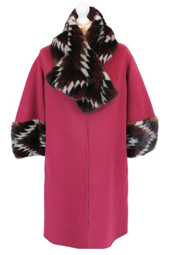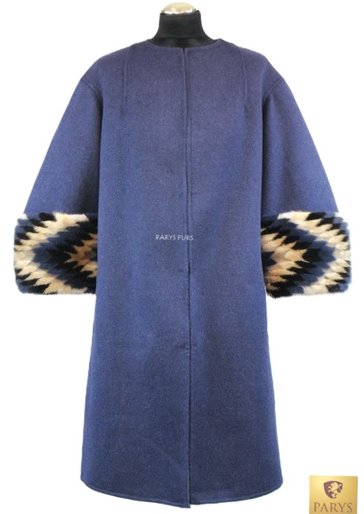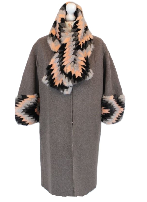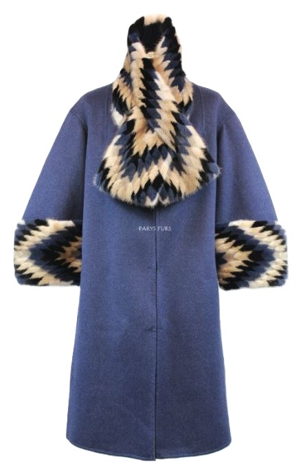 Delikatna, a zarazem niezwykle ciepła tkanina została uzupełniona wykończeniem z naturalnego futra norek, które zdobi rękawy oraz dołączony szalik, tworząc harmonijną całość o wyjątkowym charakterze.