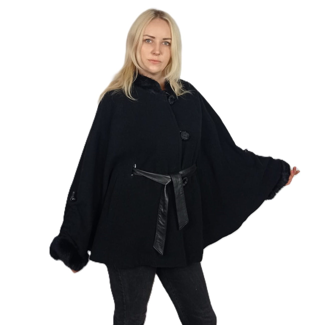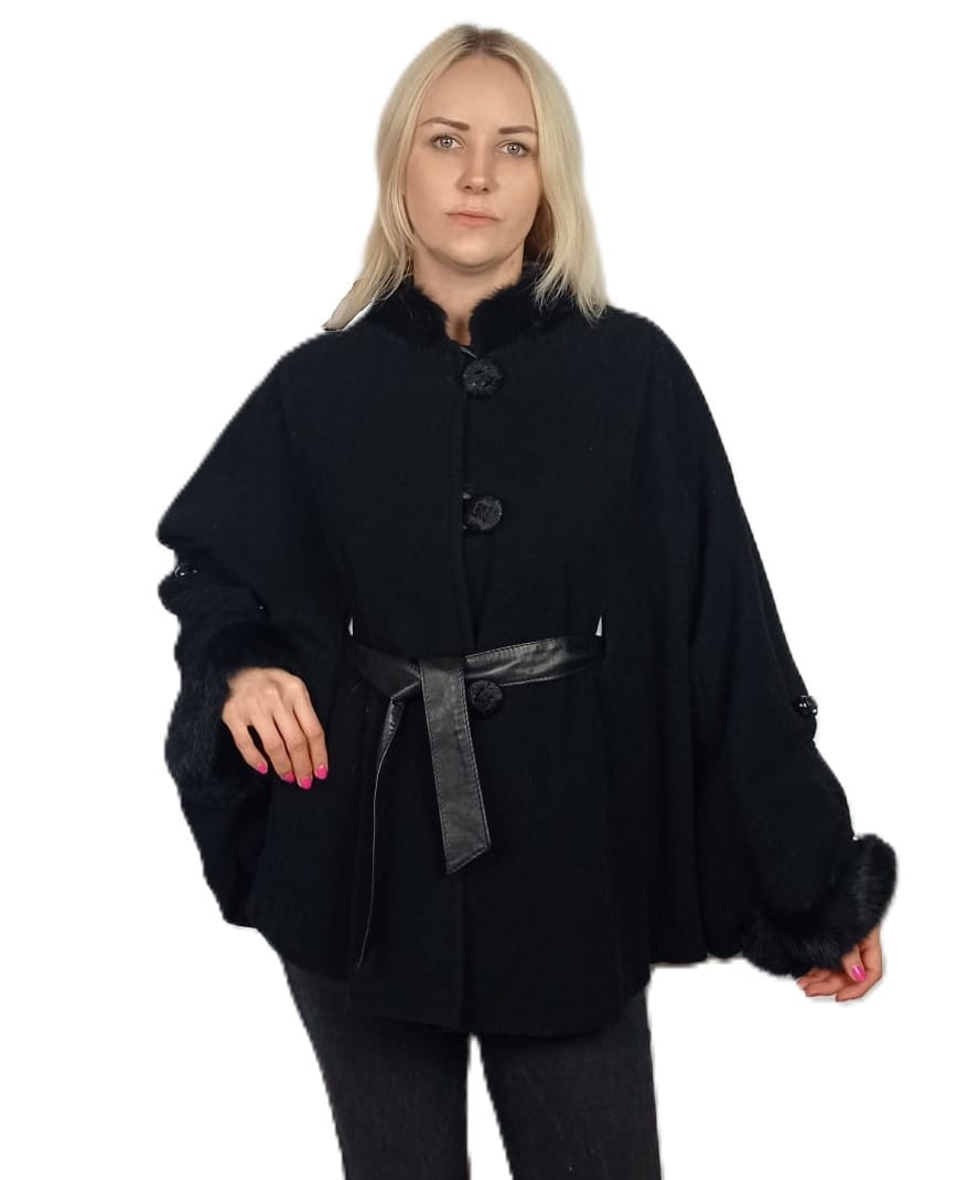 Wyjątkowa stylowa i kobieca peleryna, wykończona przy szyi oraz na mankietach miękkim, naturalnym futrem królika Rex.