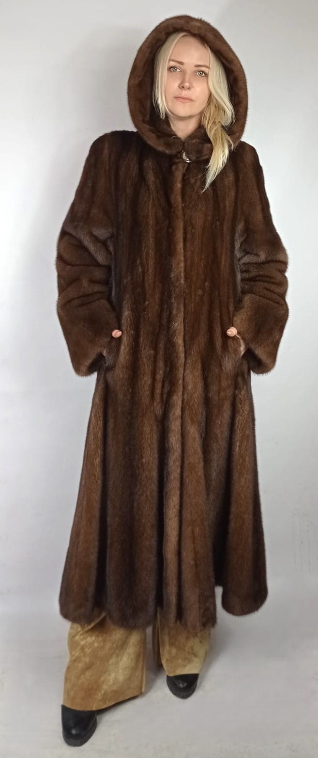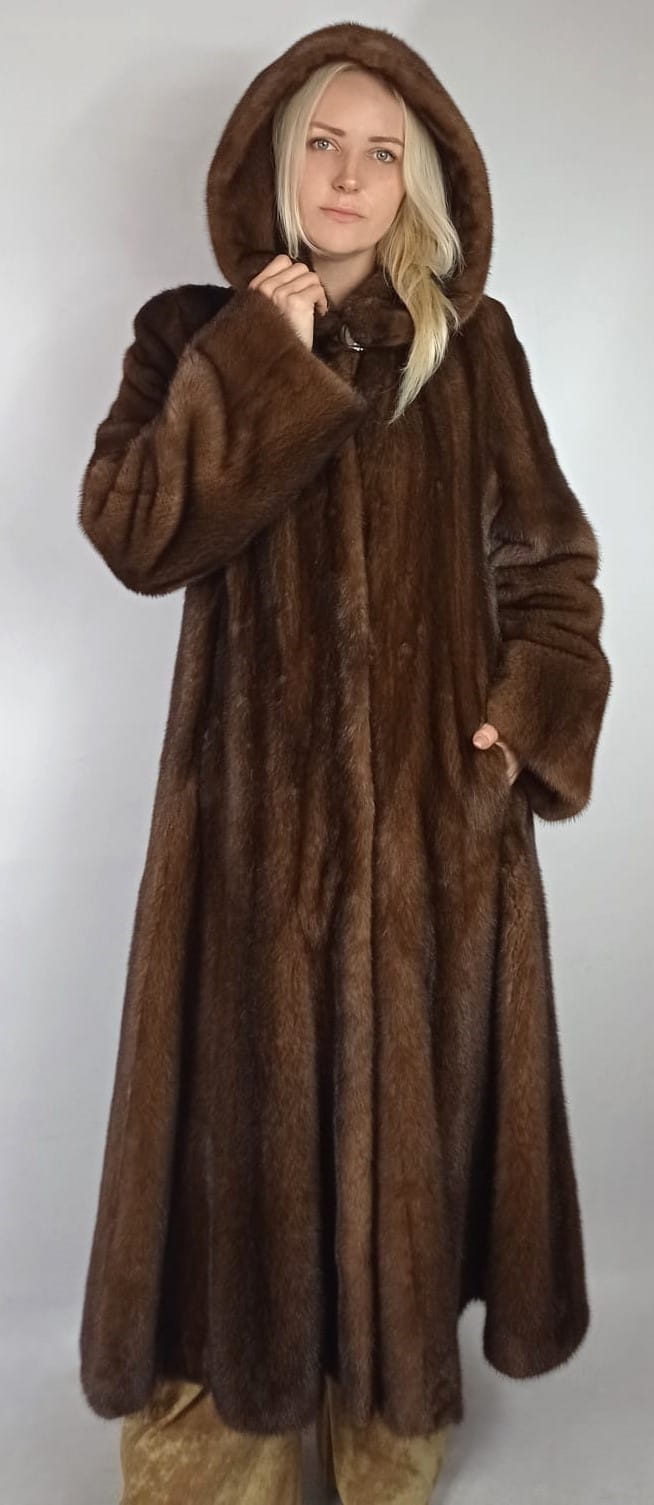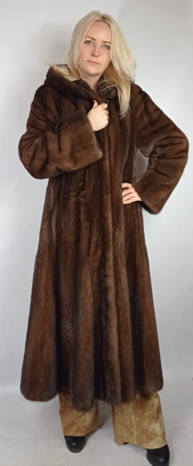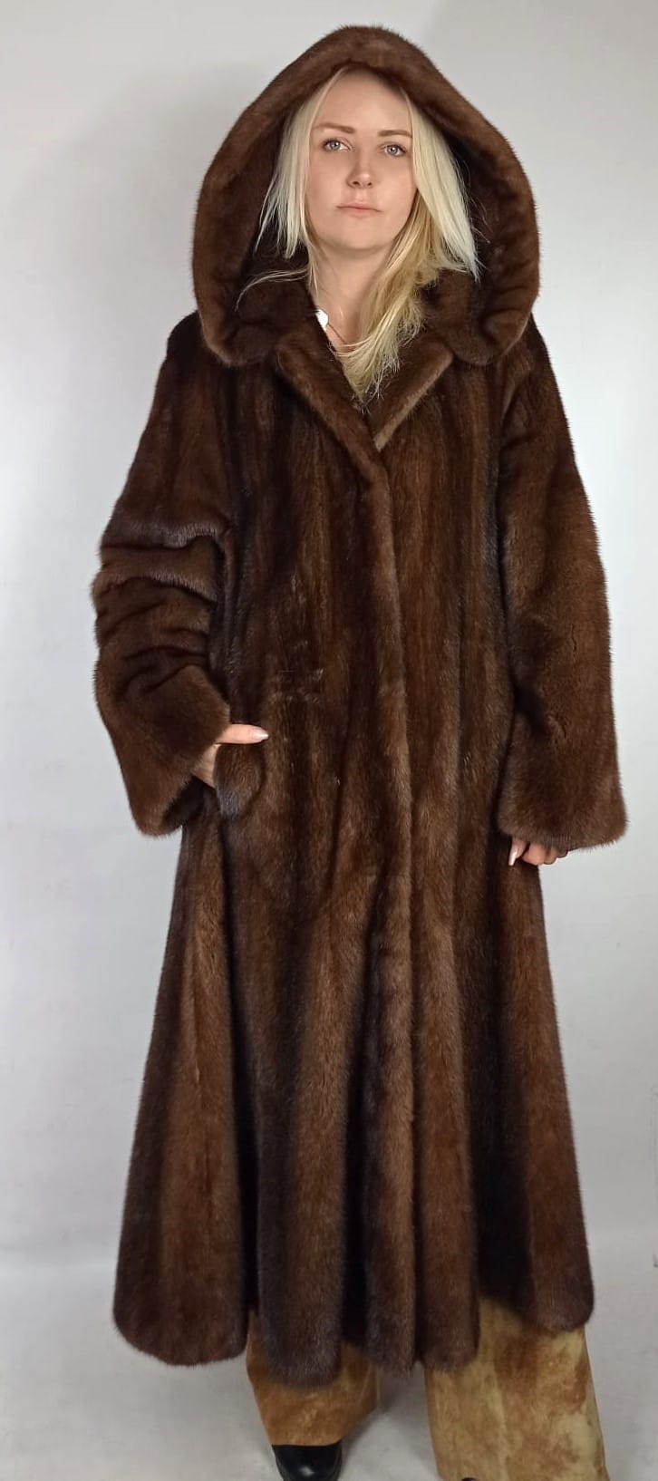 Płaszcz futrzany wykonany z najwyższej jakości naturalnego futra norek w głębokim, nasyconym odcieniu kasztanowego brązu.