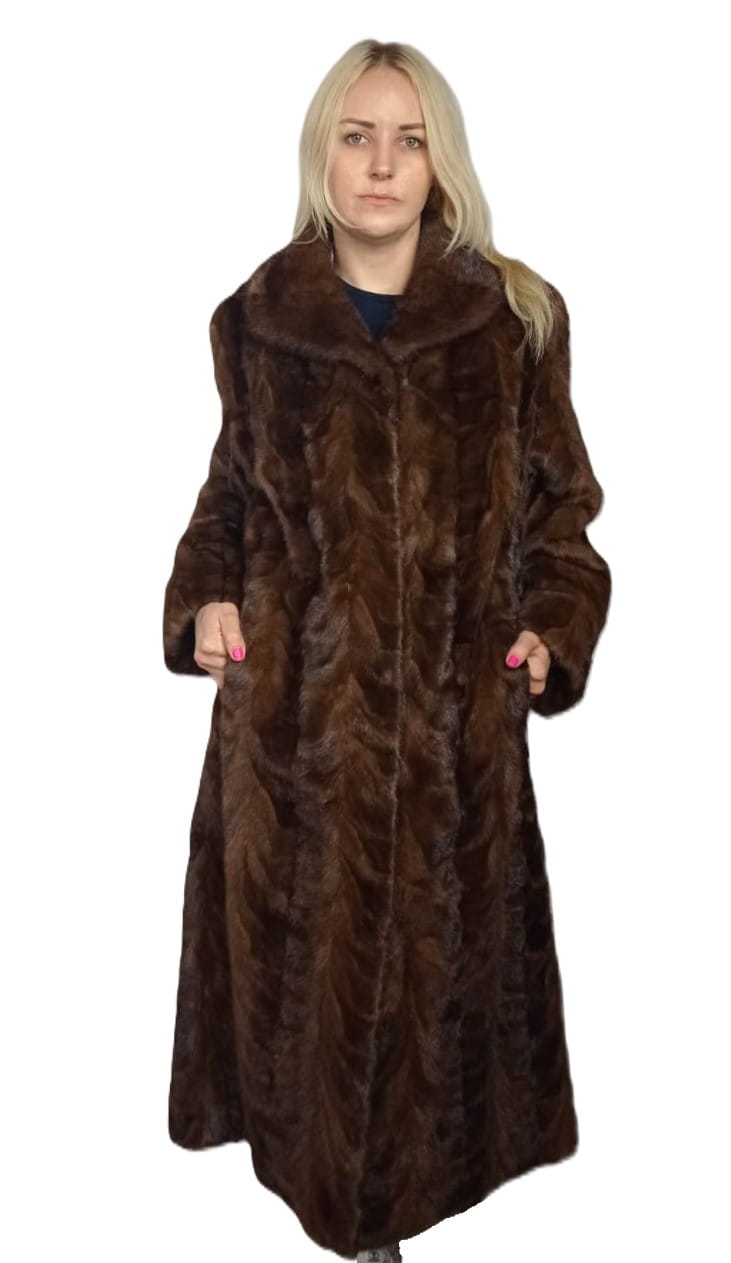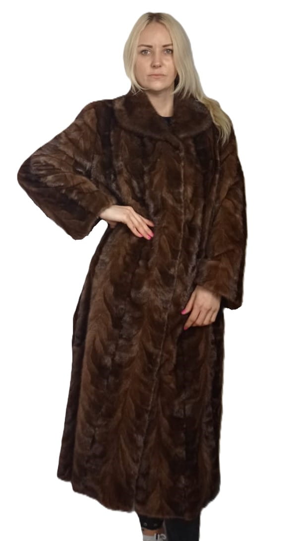 Luksusowy płaszcz wykonany z naturalnego futra norek, szyty z kawałków w sposób zapewniający harmonijny układ i wyjątkową strukturę powierzchni.